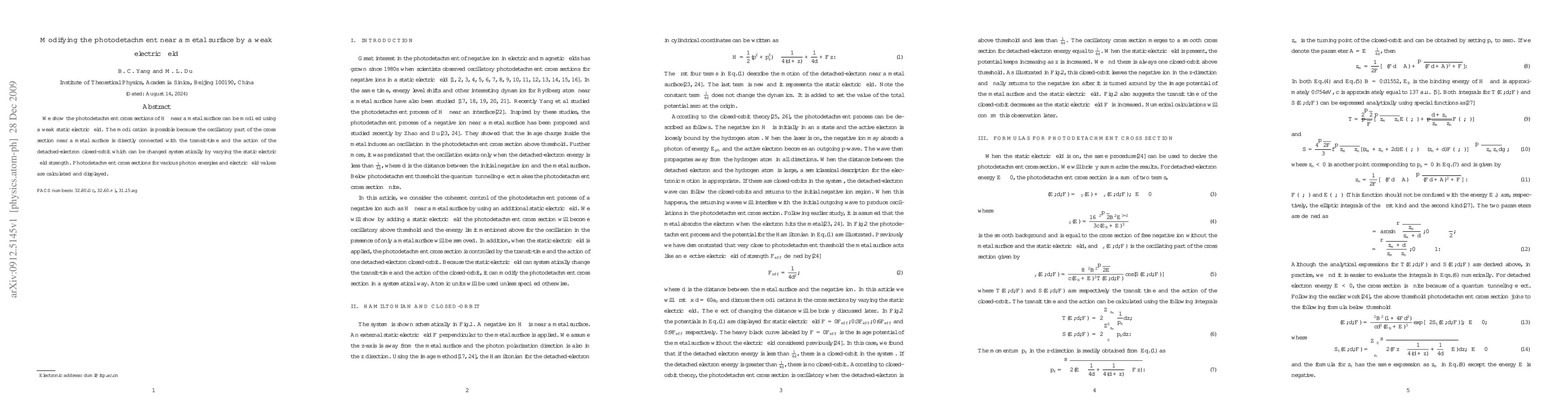 This study demonstrates that the photodetachment cross sections of H near a metal surface can be modified by a weak static electric field, with the effect stemming from changes in the detached-electron closed-orbit influenced by the transit-time. The research provides detailed calculations of these cross sections for different photon energies and electric field strengths.