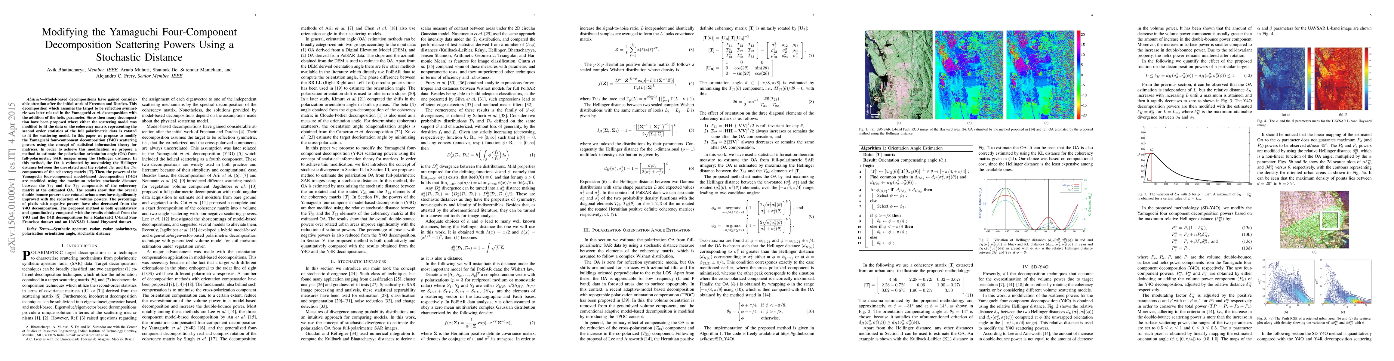This paper proposes a method to modify Yamaguchi's four-component decomposition (Y4O) scattering powers using statistical information theory and the Hellinger distance to estimate polarization orientation. The modified decomposition shows improved double-bounce powers and reduced negative powers in urban areas compared to traditional Y4O and Y4R decompositions.