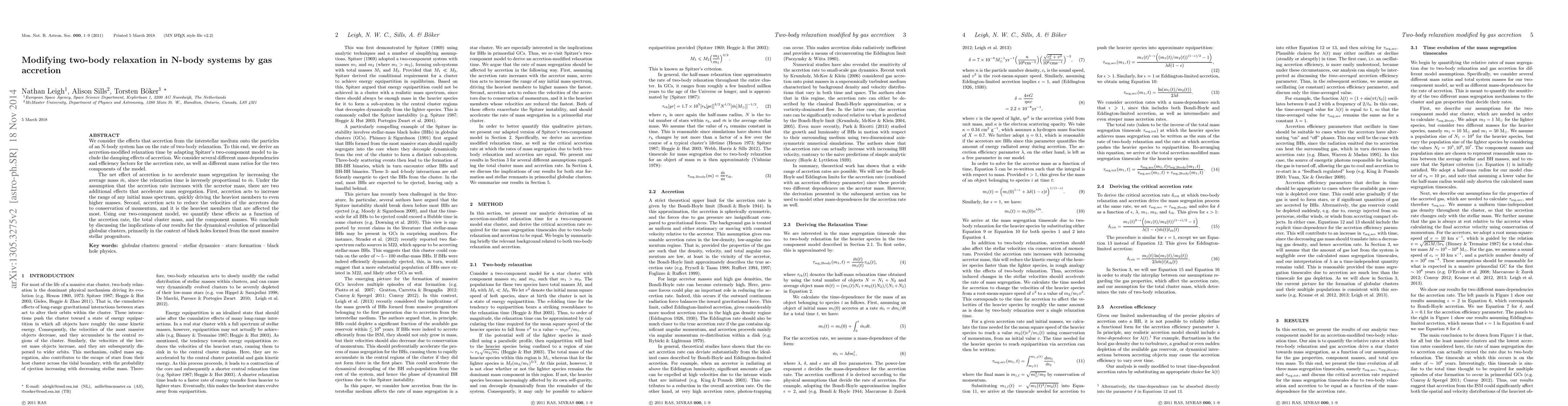 We consider the effects that accretion from the interstellar medium onto the particles of an N-body system has on the rate of two-body relaxation. To this end, we derive an accretion-modified relaxation time by adapting Spitzer's two-component model to include the damping effects of accretion. We consider several different mass-dependencies and efficiency factors for the accretion rate, as well as different mass ratios for the two components of the model. The net effect of accretion is to accelerate mass segregation by increasing the average mass $\bar{m}$, since the relaxation time is inversely proportional to $\bar{m}$. Under the assumption that the accretion rate increases with the accretor mass, there are two additional effects that accelerate mass segregation. First, accretion acts to increase the range of any initial mass spectrum, quickly driving the heaviest members to even higher masses. Second, accretion acts to reduce the velocities of the accretors due to conservation of momentum, and it is the heaviest members that are affected the most. Using our two-component model, we quantify these effects as a function of the accretion rate, the total cluster mass, and the component masses. We conclude by discussing the implications of our results for the dynamical evolution of primordial globular clusters, primarily in the context of black holes formed from the most massive stellar progenitors.