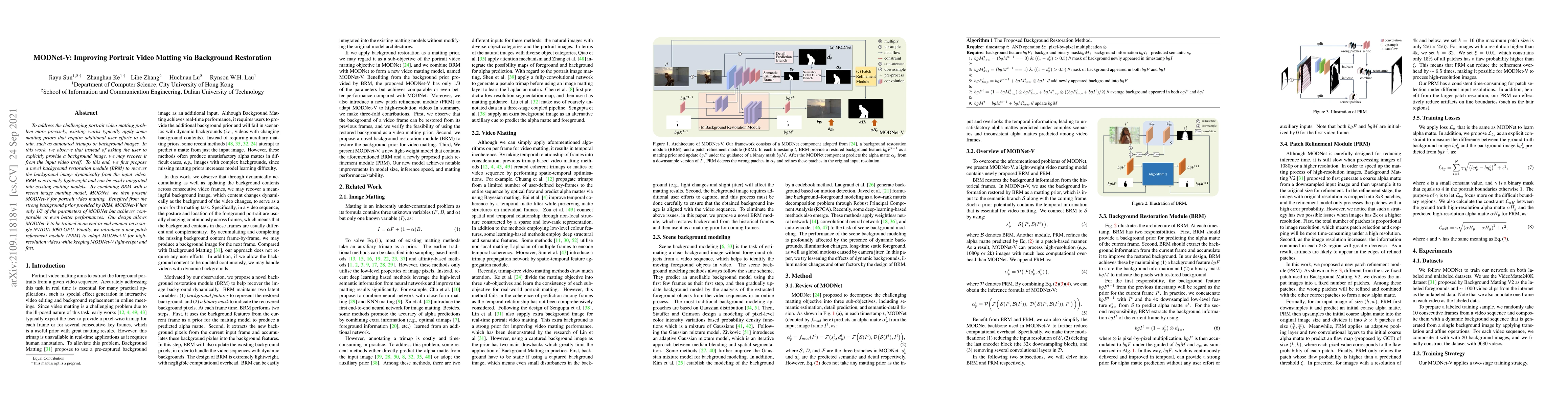 To address the challenging portrait video matting problem more precisely, existing works typically apply some matting priors that require additional user efforts to obtain, such as annotated trimaps or background images. In this work, we observe that instead of asking the user to explicitly provide a background image, we may recover it from the input video itself. To this end, we first propose a novel background restoration module (BRM) to recover the background image dynamically from the input video. BRM is extremely lightweight and can be easily integrated into existing matting models. By combining BRM with a recent image matting model, MODNet, we then present MODNet-V for portrait video matting. Benefited from the strong background prior provided by BRM, MODNet-V has only 1/3 of the parameters of MODNet but achieves comparable or even better performances. Our design allows MODNet-V to be trained in an end-to-end manner on a single NVIDIA 3090 GPU. Finally, we introduce a new patch refinement module (PRM) to adapt MODNet-V for high-resolution videos while keeping MODNet-V lightweight and fast.