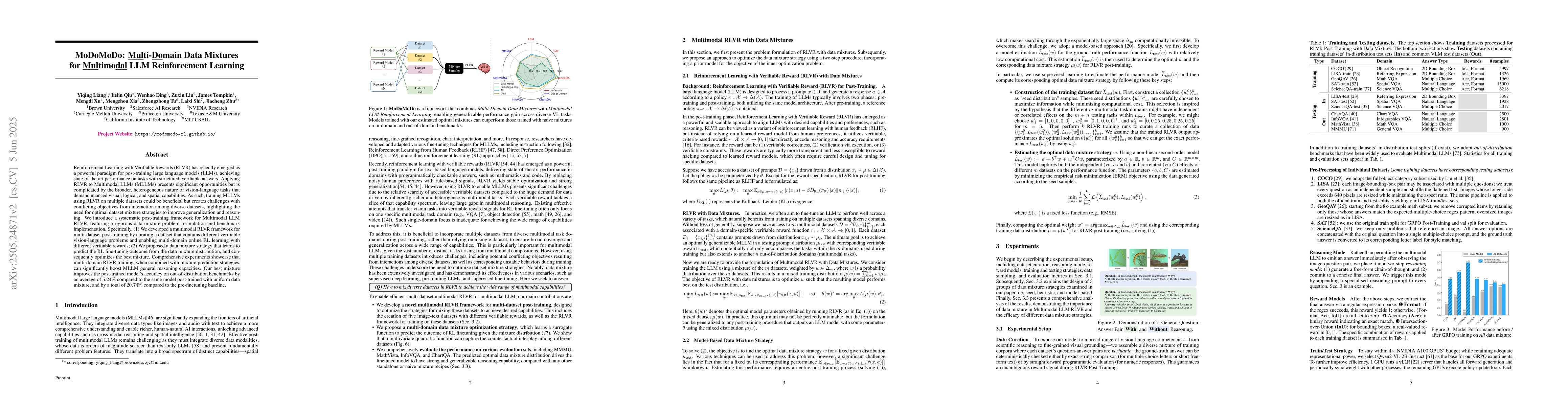 The paper introduces MoDoMoDo, a framework that couples multi-domain data mixtures with reinforcement learning under verifiable rewards (RLVR) for multimodal large language models (MLLMs). It leverages five complementary image-text datasets equipped with rule-based reward functions to train a lightweight quadratic surrogate model for predicting post-training performance based on the mixture distribution.
