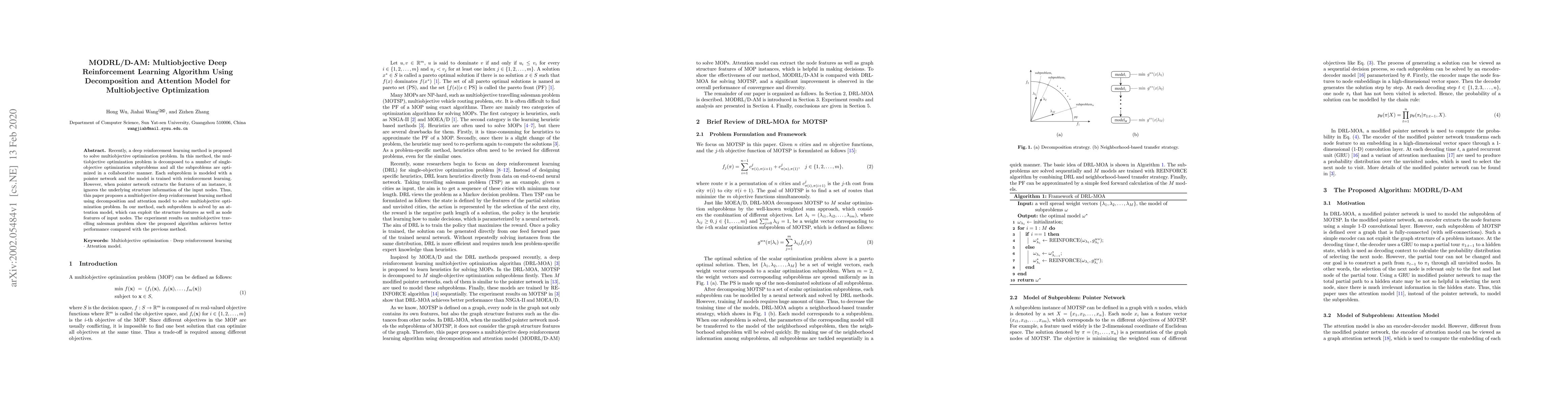 Title: MODRL/D-AM: Multiobjective Deep Reinforcement Learning Algorithm Using Decomposition and Attention Model for Multiobjective Optimization Summary: This paper introduces a multiobjective deep reinforcement learning algorithm that decomposes optimization problems into single-objective subproblems, employing an attention model to leverage structure and node features, achieving superior performance on the multiobjective travelling salesman problem compared to previous methods.