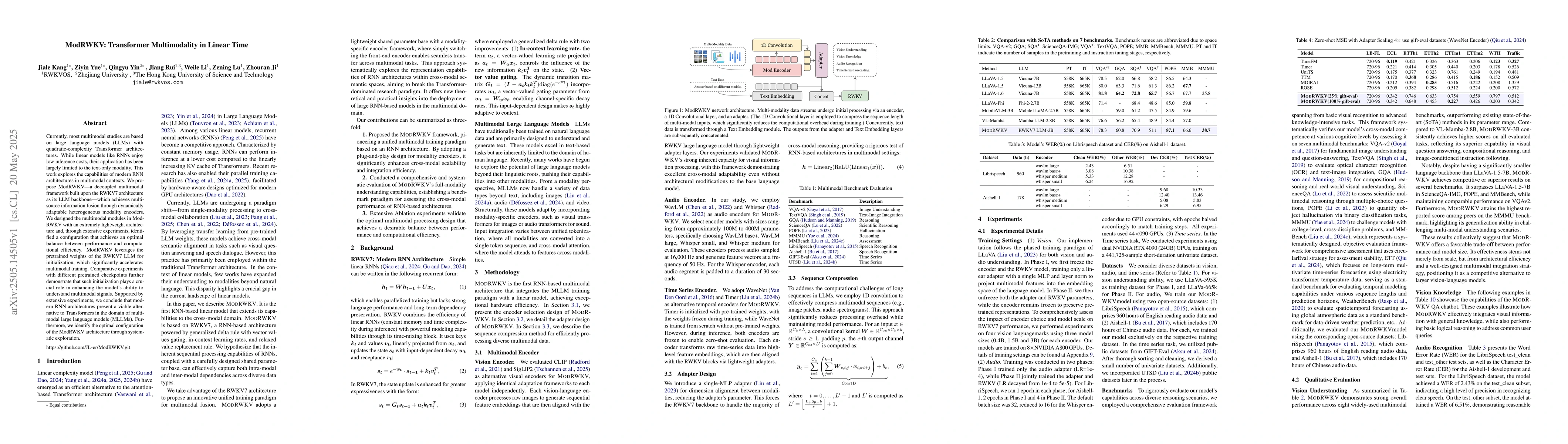 The research proposes ModRWKV, a decoupled multimodal framework based on the RWKV7 architecture, utilizing dynamically adaptable heterogeneous modality encoders for multi-source information fusion.