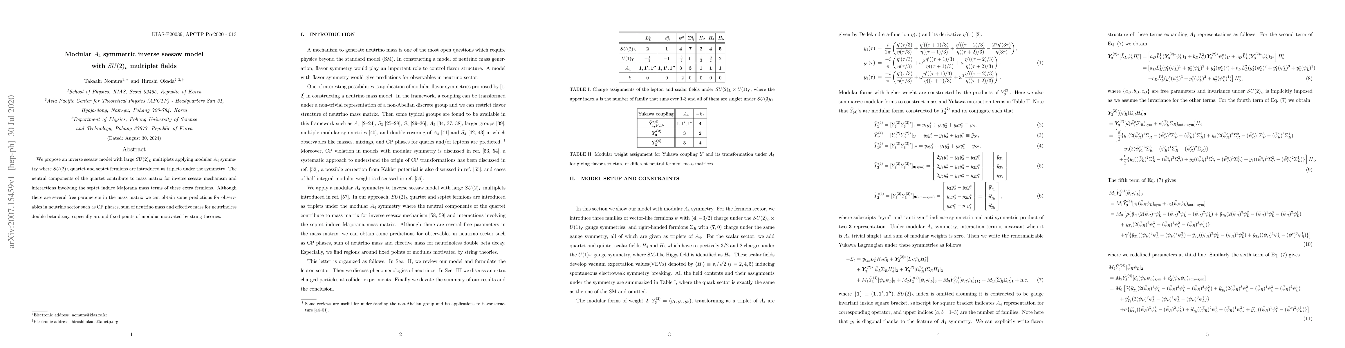 This paper proposes a new inverse seesaw model with $SU(2)_L$ multiplets applying modular $A_4$ symmetry to explain neutrino mass and CP phases, offering predictions for observables in the neutrino sector.