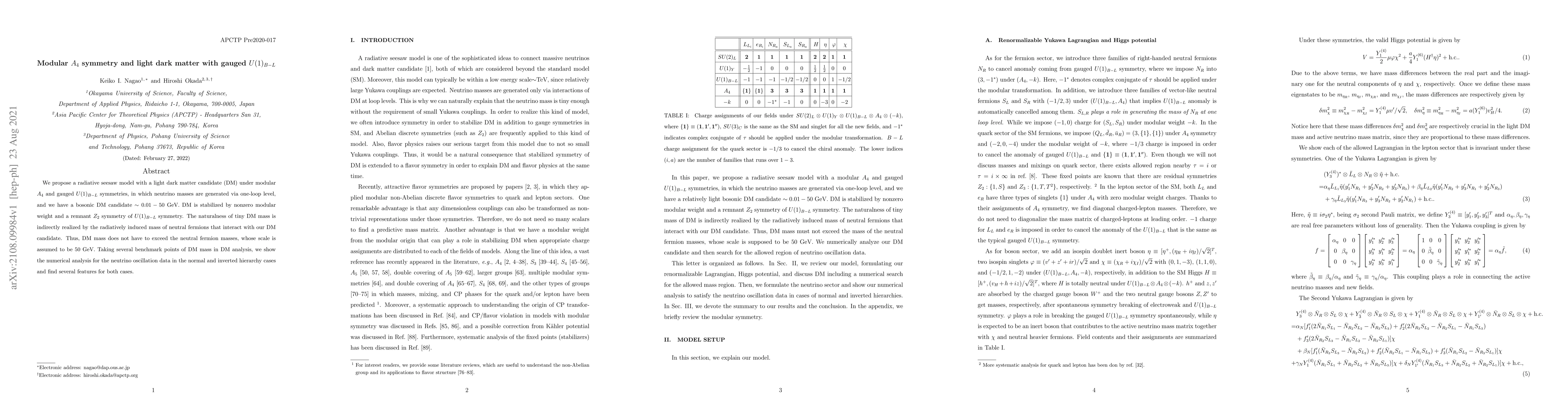 We propose a radiative seesaw model with a light dark matter candidate (DM) under modular $A_4$ and gauged $U(1)_{B-L}$ symmetries, in which neutrino masses are generated via one-loop level, and we have a bosonic DM candidate $\sim 0.01-50$ GeV. DM is stabilized by nonzero modular weight and a remnant $Z_2$ symmetry of $U(1)_{B-L}$ symmetry. The naturalness of tiny DM mass is indirectly realized by the radiatively induced mass of neutral fermions that interact with our DM candidate. Thus, DM mass does not have to exceed the neutral fermion masses, whose scale is assumed to be 50 GeV. Taking several benchmark points of DM mass in DM analysis, we show the numerical analysis for the neutrino oscillation data in the normal and inverted hierarchy cases and find several features for both cases.