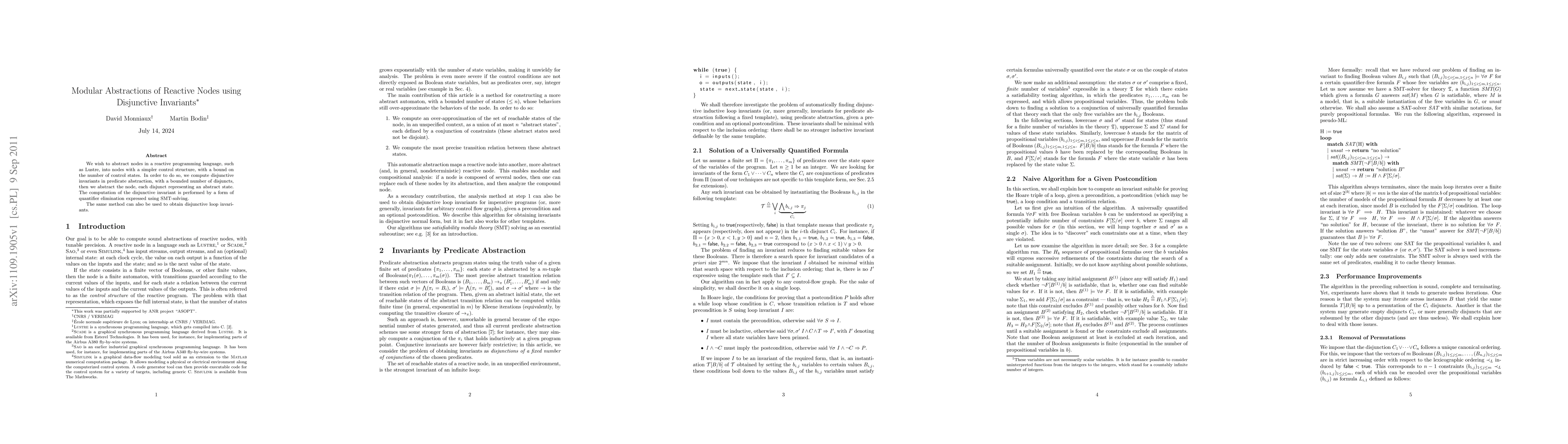 The paper presents a method for modular abstractions of reactive nodes using disjunctive invariants in predicate abstraction, employing SMT-solving for quantifier elimination. It details an iterative refinement process for obtaining minimal invariants within a search space and discusses extensions such as prohibiting overlapping modes and other template forms.