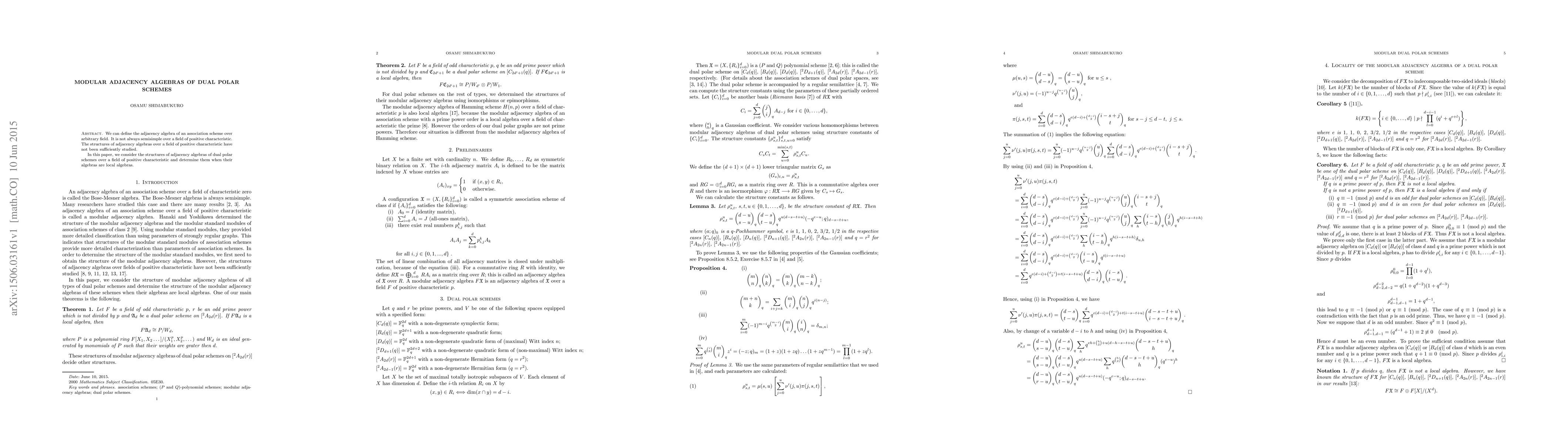 We can define the adjacency algebra of an association scheme over arbitrary field. It is not always semisimple over a field of positive characteristic. The structures of adjacency algebras over a field of positive characteristic have not been sufficiently studied. In this paper, we consider the structures of adjacency algebras of dual polar schemes over a field of positive characteristic and determine them when their algebras are local algebras.