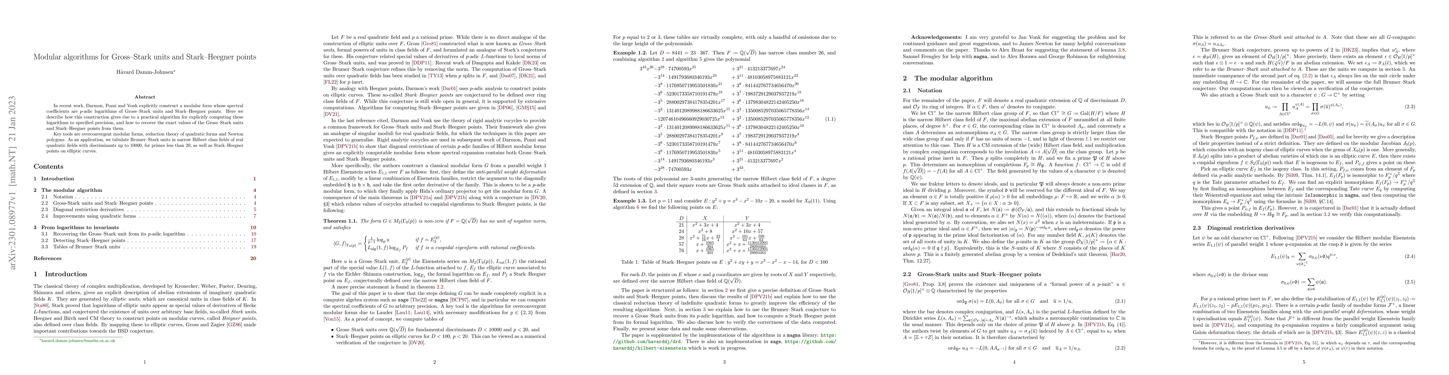 This paper presents modular algorithms for computing Gross-Stark units and Stark-Heegner points using overconvergent modular forms and reduction theory. The algorithms allow for precise computation of $p$-adic logarithms and recovery of exact values, facilitating the tabulation of relevant units and points.