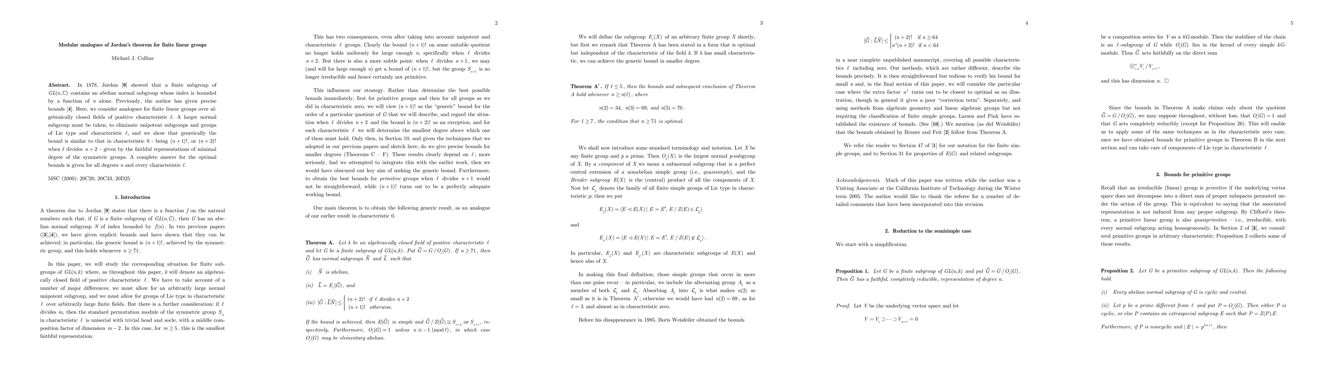 In 1878, Jordan showed that a finite subgroup of GL(n,C) contains an abelian normal subgroup whose index is bounded by a function of n alone. Previously, the author has given precise bounds. Here, we consider analogues for finite linear groups over algebraically closed fields of positive characteristic l. A larger normal subgroup must be taken, to eliminate unipotent subgroups and groups of Lie type and characteristic l, and we show that generically the bound is similar to that in characteristic 0 - being (n+1)!, or (n+2)! when l divides (n+2) - given by the faithful representations of minimal degree of the symmetric groups. A complete answer for the optimal bounds is given for all degrees n and every characteristic l.