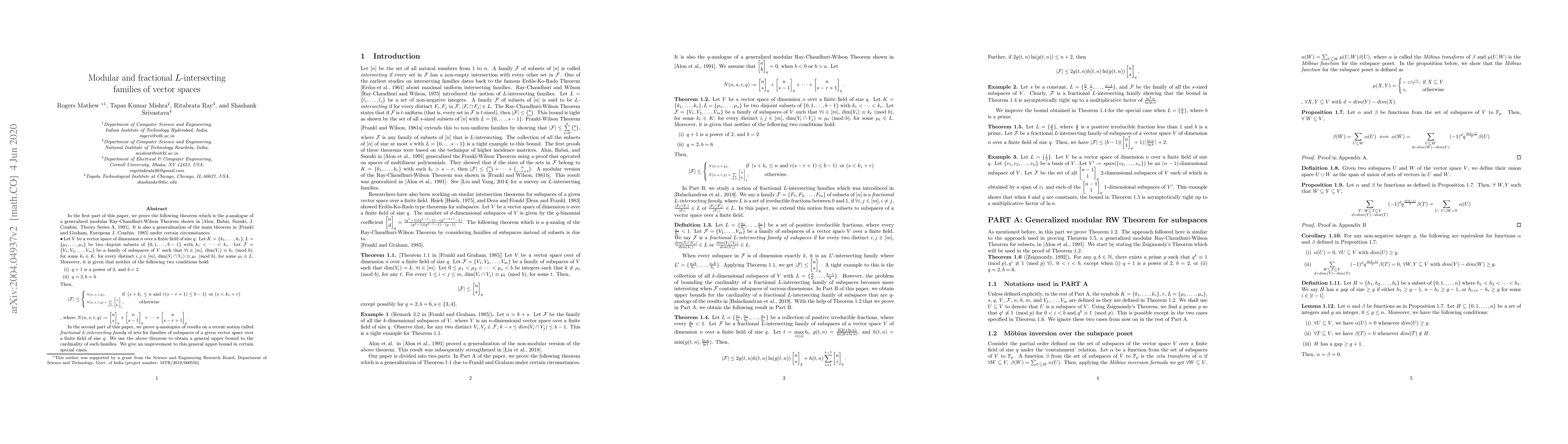 In the first part of this paper, we prove a theorem which is the $q$-analogue of a generalized modular Ray-Chaudhuri-Wilson Theorem shown in [Alon, Babai, Suzuki, J. Combin. Theory Series A, 1991]. It is also a generalization of the main theorem in [Frankl and Graham, European J. Combin. 1985] under certain circumstances. In the second part of this paper, we prove $q$-analogues of results on a recent notion called \emph{fractional $L$-intersecting family} for families of subspaces of a given vector space. We use the above theorem to obtain a general upper bound to the cardinality of such families. We give an improvement to this general upper bound in certain special cases.