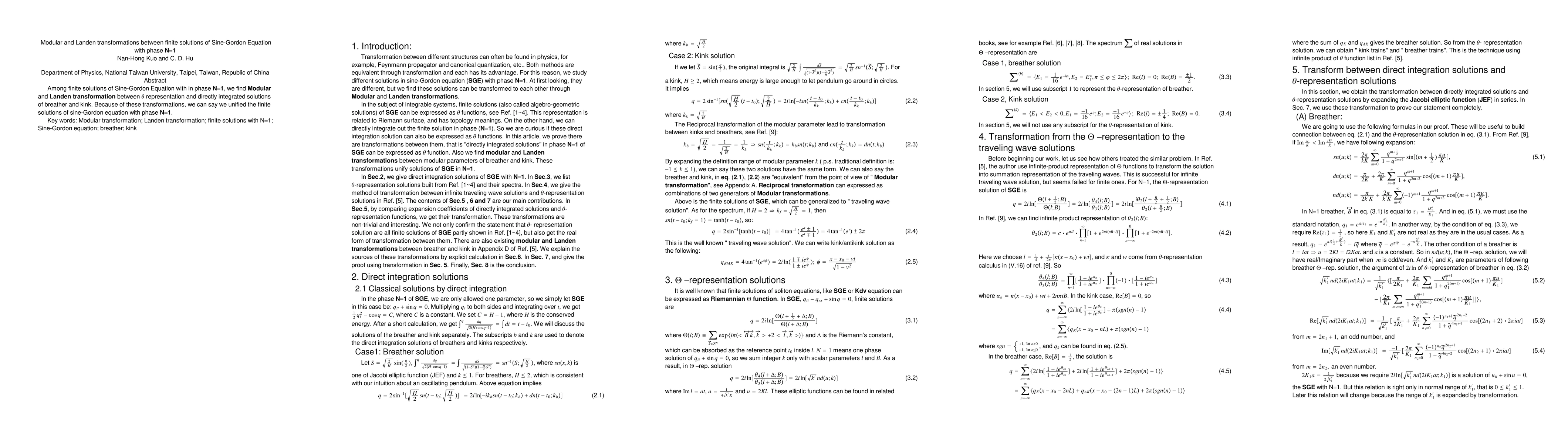 This paper explores modular and Landen transformations between finite solutions of the Sine-Gordon Equation with phase N=1, revealing connections between θ representation and directly integrated breather and kink solutions, thereby unifying these solutions.