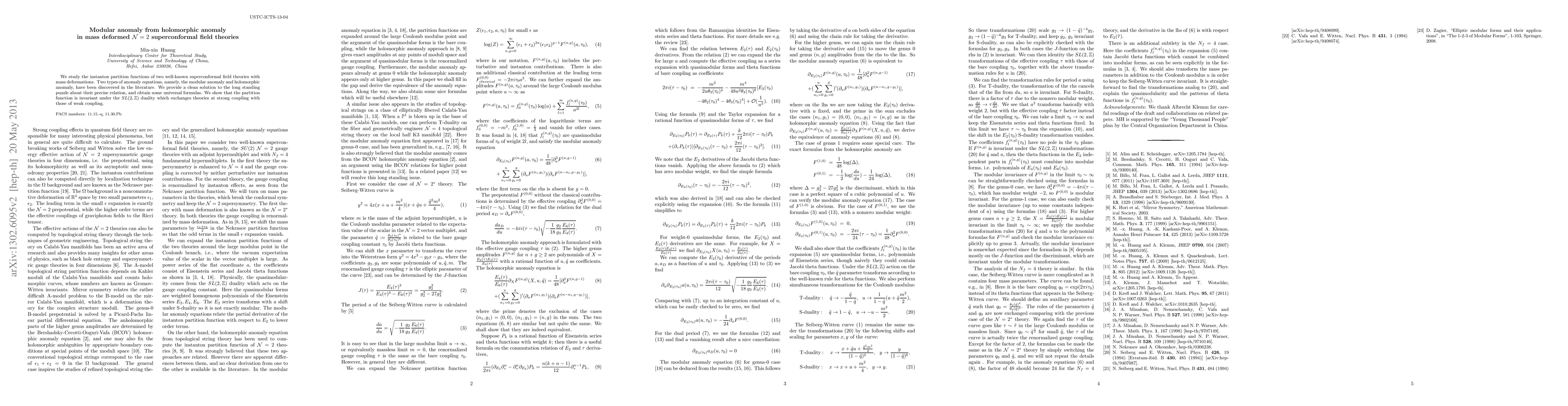 This paper resolves the longstanding puzzle regarding the relationship between modular and holomorphic anomalies in mass-deformed N=2 superconformal field theories, revealing universal formulas and demonstrating SL(2,Z) duality invariance in the partition functions.