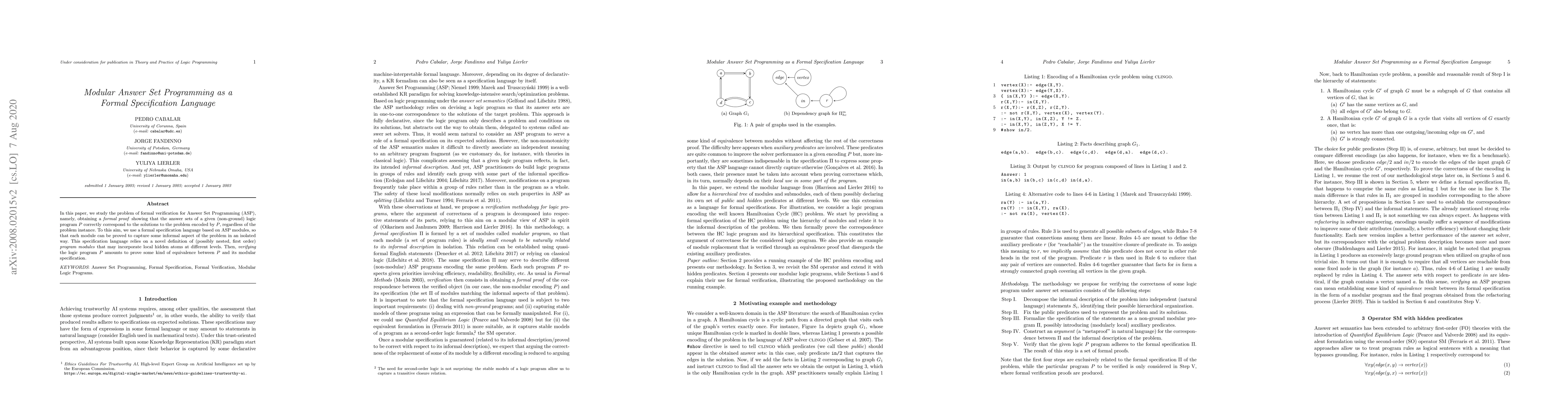 This paper proposes a formal specification language based on modular Answer Set Programming (ASP) to verify that the answer sets of a given ASP program correctly correspond to the problem solutions, using isolated modules to capture problem aspects and proving equivalence between the program and its modular specification. The approach incorporates novel definitions of nested program modules with local hidden atoms.