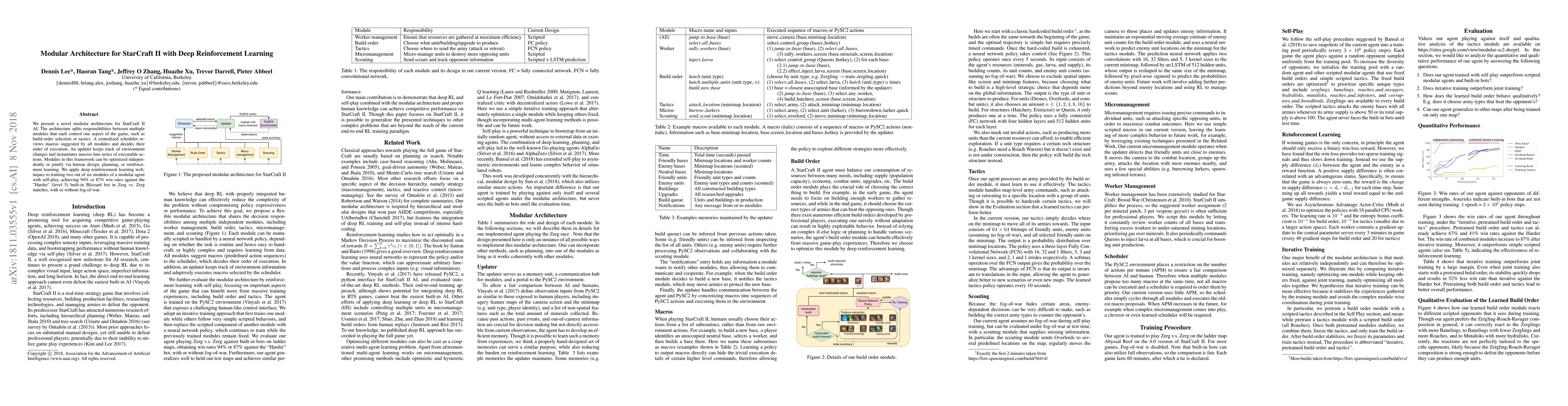 This research introduces a modular AI architecture for StarCraft II, where distinct modules handle specific game aspects, coordinated by a centralized scheduler. Deep reinforcement learning is employed to train two modules, achieving high win rates against Blizzard's built-in "Harder" bot in Zerg vs. Zerg scenarios.