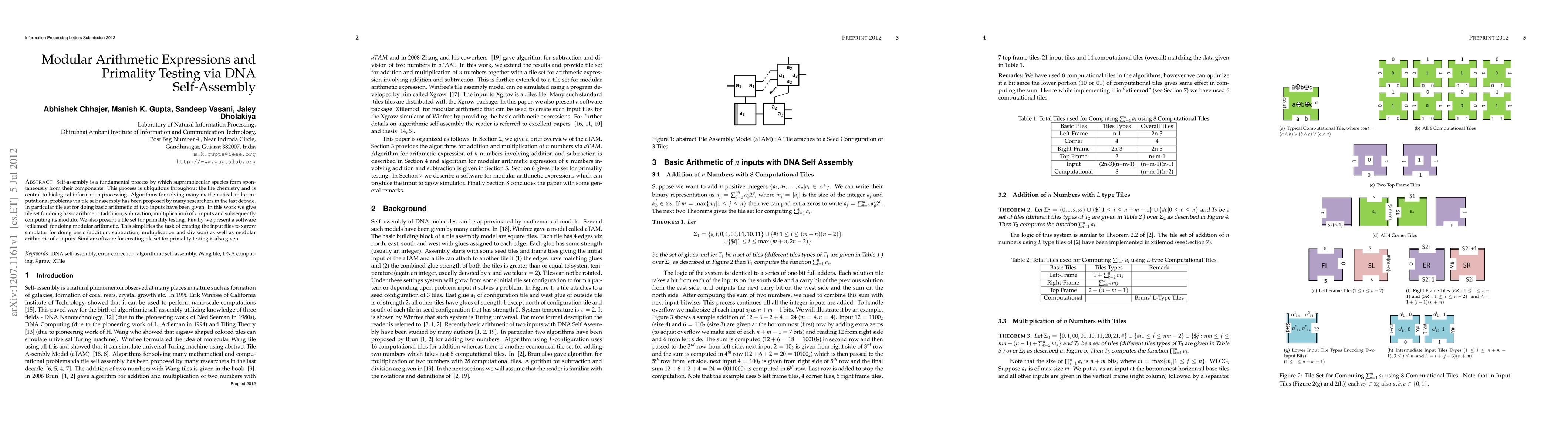 Self-assembly is a fundamental process by which supramolecular species form spontaneously from their components. This process is ubiquitous throughout the life chemistry and is central to biological information processing. Algorithms for solving many mathematical and computational problems via tile self assembly have been proposed by many researchers in the last decade. In particular tile set for doing basic arithmetic of two inputs have been given. In this work we give tile set for doing basic arithmetic (addition, subtraction, multiplication) of n inputs and subsequently computing its modulo. We also present a tile set for primality testing. Finally we present a software 'xtilemod' for doing modular arithmetic. This simplifies the task of creating the input files to xgrow simulator for doing basic (addition, subtraction, multiplication and division) as well as modular arithmetic of n inputs. Similar software for creating tile set for primality testing is also given.