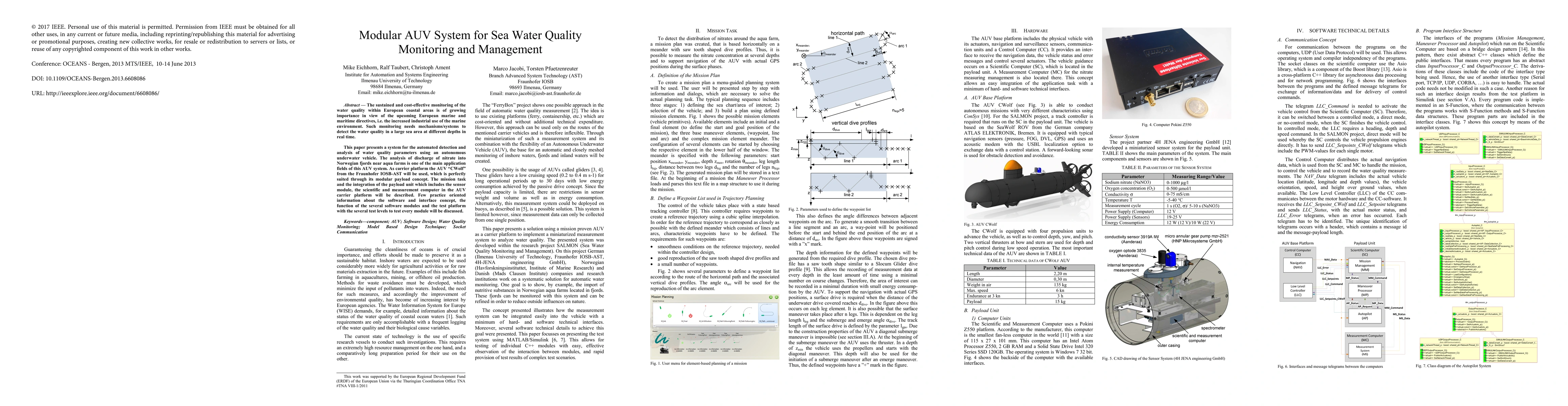 A new autonomous underwater vehicle (AUV) system is presented for monitoring water quality in European coastal areas, using a modular design to detect pollutants like nitrate at different depths in real-time.