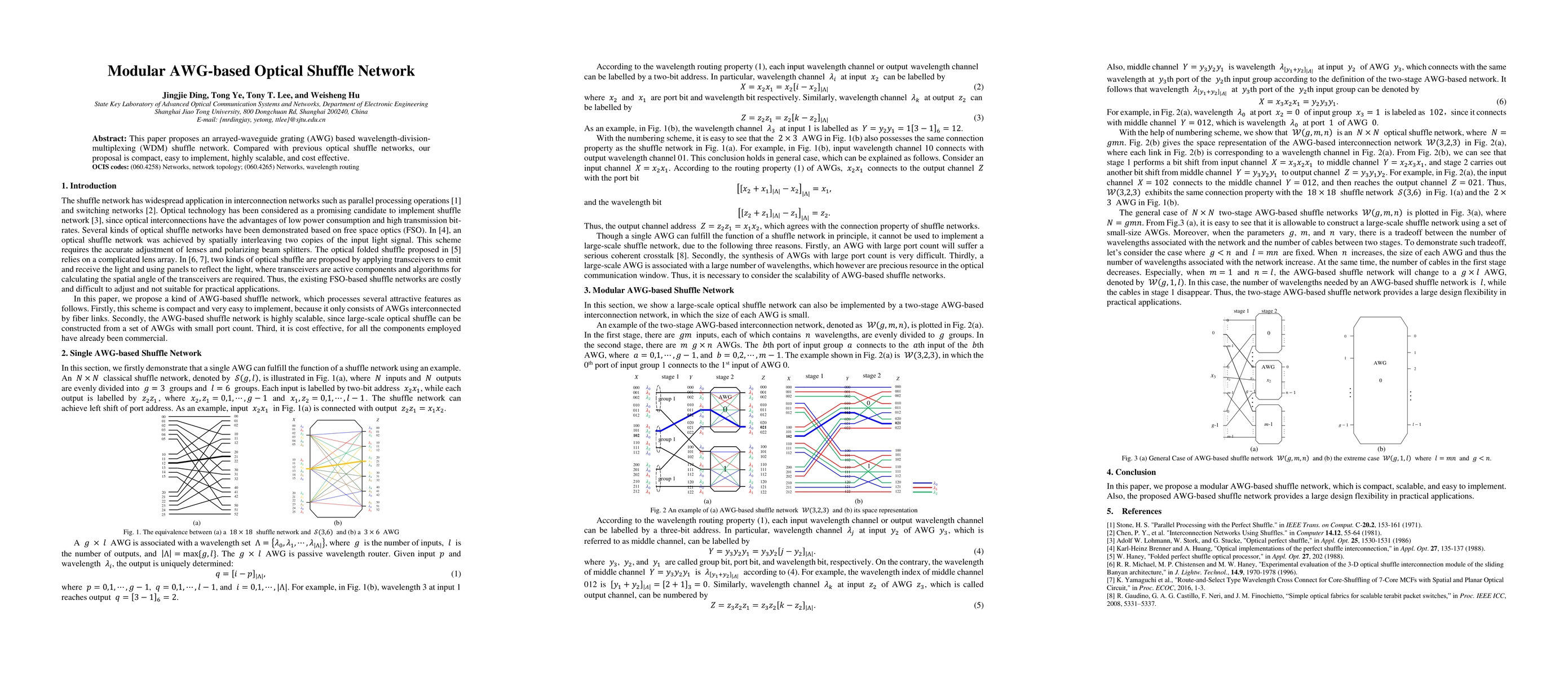 Summary: This paper introduces a compact, scalable, and cost-effective AWG-based WDM shuffle network for optical communication, offering an efficient alternative to previous optical shuffle networks. The design is both easy to implement and highly adaptable for future expansion.