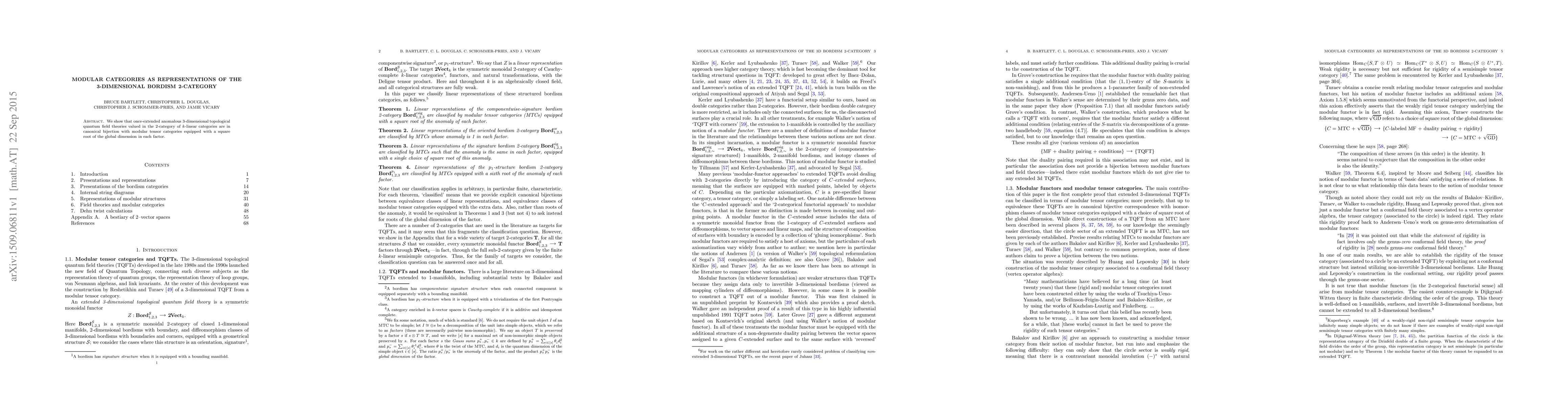 We show that once-extended anomalous 3-dimensional topological quantum field theories valued in the 2-category of k-linear categories are in canonical bijection with modular tensor categories equipped with a square root of the global dimension in each factor.