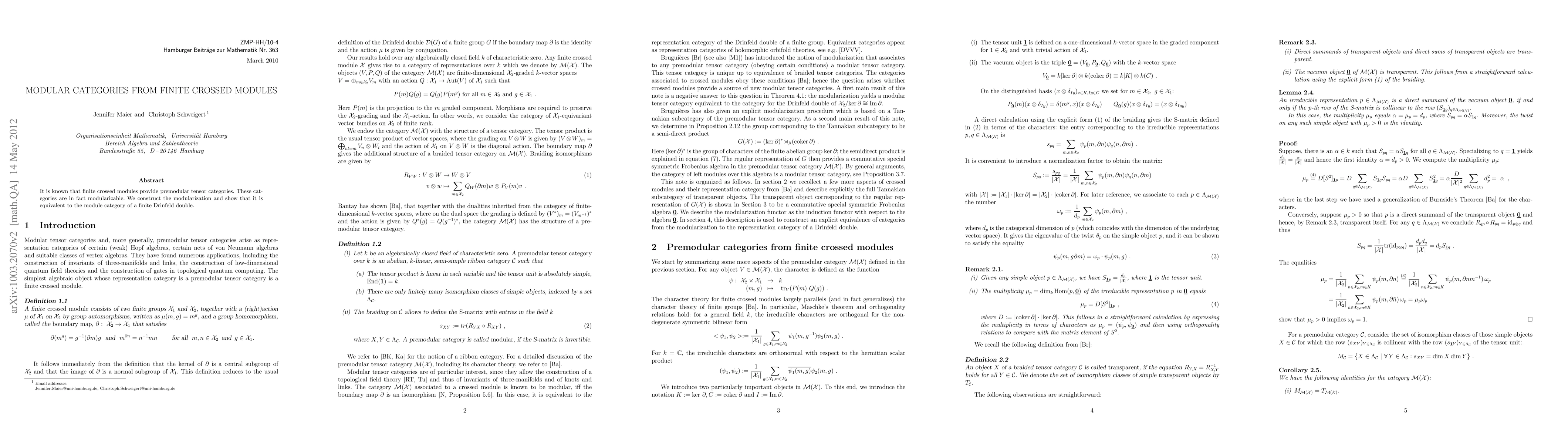 This research demonstrates that finite crossed modules yield premodular tensor categories, which are modularizable. The paper constructs a modularization equivalent to the module category of a finite Drinfeld double, thereby linking these algebraic structures.