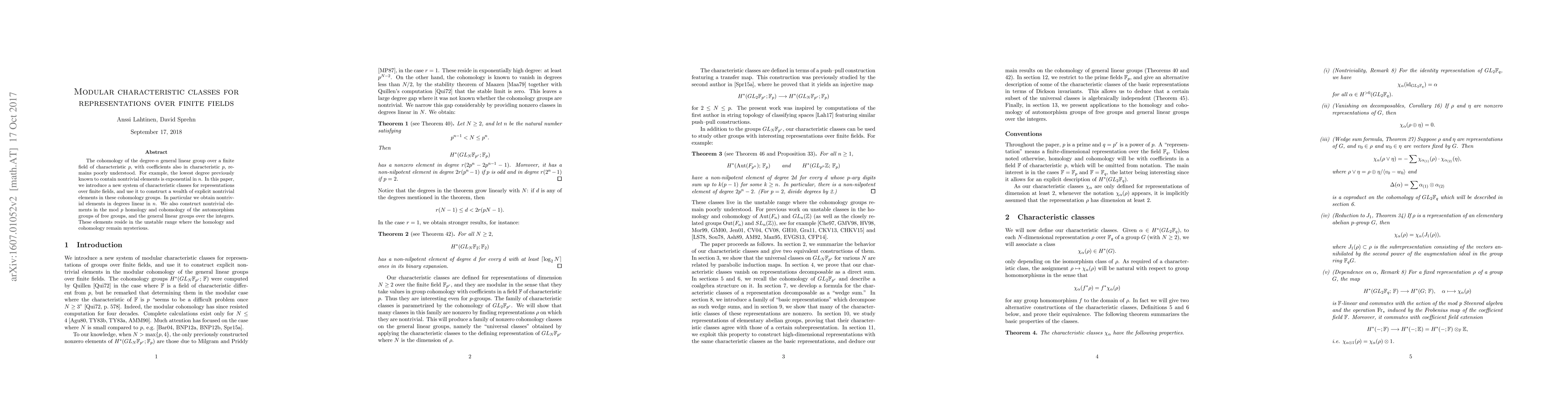 The cohomology of the degree-$n$ general linear group over a finite field of characteristic $p$, with coefficients also in characteristic $p$, remains poorly understood. For example, the lowest degree previously known to contain nontrivial elements is exponential in $n$. In this paper, we introduce a new system of characteristic classes for representations over finite fields, and use it to construct a wealth of explicit nontrivial elements in these cohomology groups. In particular we obtain nontrivial elements in degrees linear in $n$. We also construct nontrivial elements in the mod $p$ homology and cohomology of the automorphism groups of free groups, and the general linear groups over the integers. These elements reside in the unstable range where the homology and cohomology remain poorly understood.