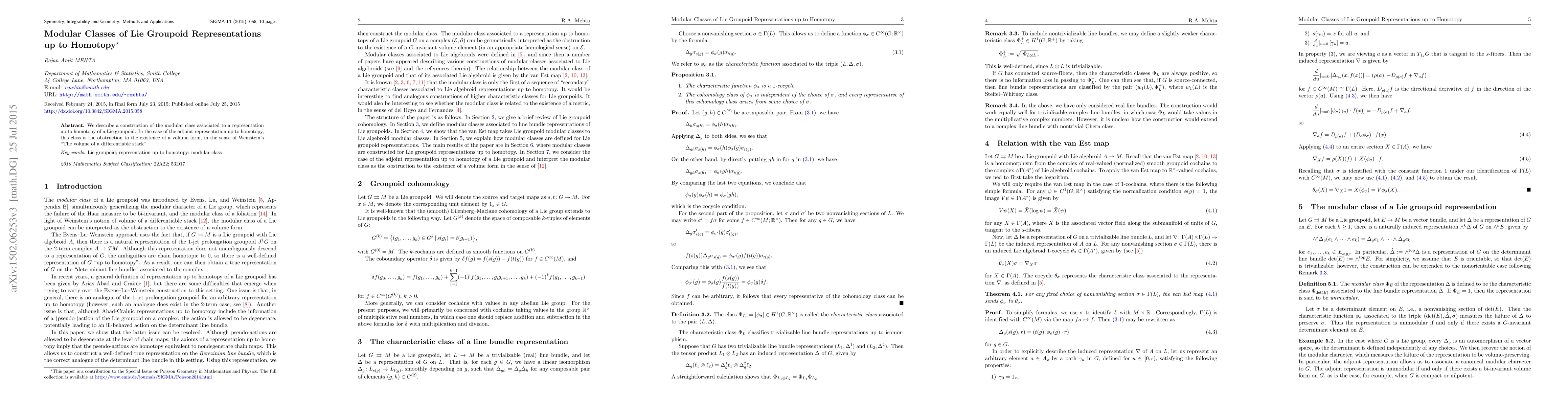 Summary: This paper constructs the modular class for representations of a Lie groupoid up to homotopy, identifying it as an obstruction to the existence of a volume form in the adjoint representation context, as per Weinstein's theory on differentiable stacks.