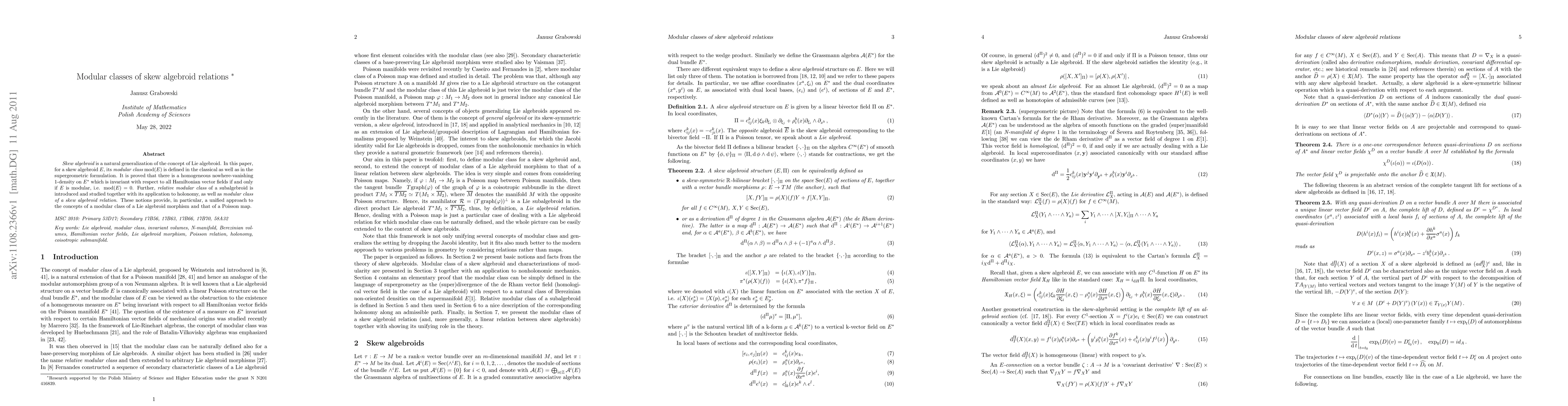 Skew algebroid is a natural generalization of the concept of Lie algebroid. In this paper, for a skew algebroid E, its modular class mod(E) is defined in the classical as well as in the supergeometric formulation. It is proved that there is a homogeneous nowhere-vanishing 1-density on E* which is invariant with respect to all Hamiltonian vector fields if and only if E is modular, i.e. mod(E)=0. Further, relative modular class of a subalgebroid is introduced and studied together with its application to holonomy, as well as modular class of a skew algebroid relation. These notions provide, in particular, a unified approach to the concepts of a modular class of a Lie algebroid morphism and that of a Poisson map.