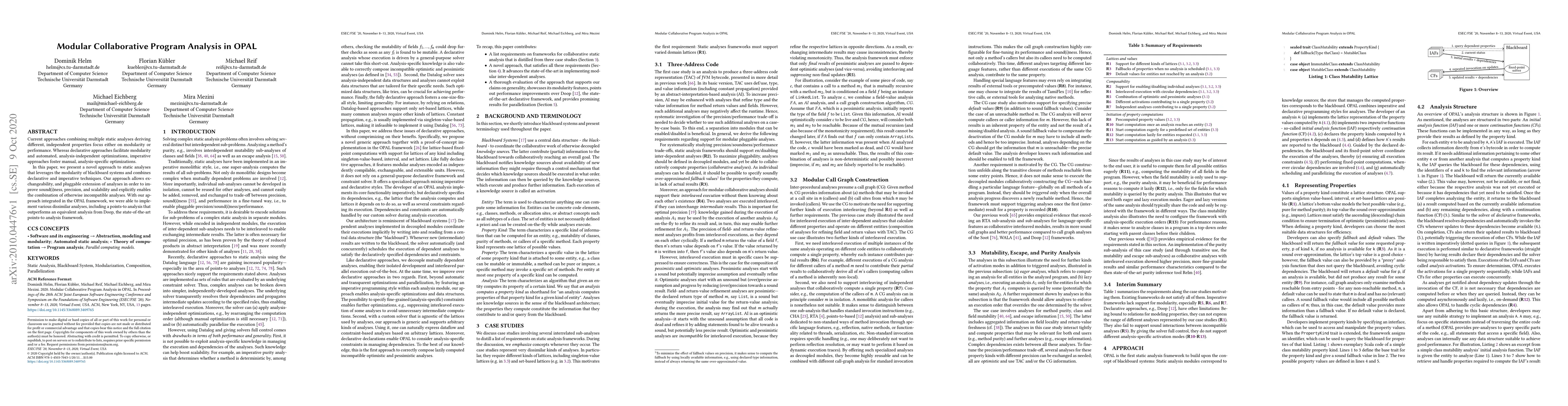 Current approaches combining multiple static analyses deriving different, independent properties focus either on modularity or performance. Whereas declarative approaches facilitate modularity and automated, analysis-independent optimizations, imperative approaches foster manual, analysis-specific optimizations. In this paper, we present a novel approach to static analyses that leverages the modularity of blackboard systems and combines declarative and imperative techniques. Our approach allows exchangeability, and pluggable extension of analyses in order to improve sound(i)ness, precision, and scalability and explicitly enables the combination of otherwise incompatible analyses. With our approach integrated in the OPAL framework, we were able to implement various dissimilar analyses, including a points-to analysis that outperforms an equivalent analysis from Doop, the state-of-the-art points-to analysis framework.