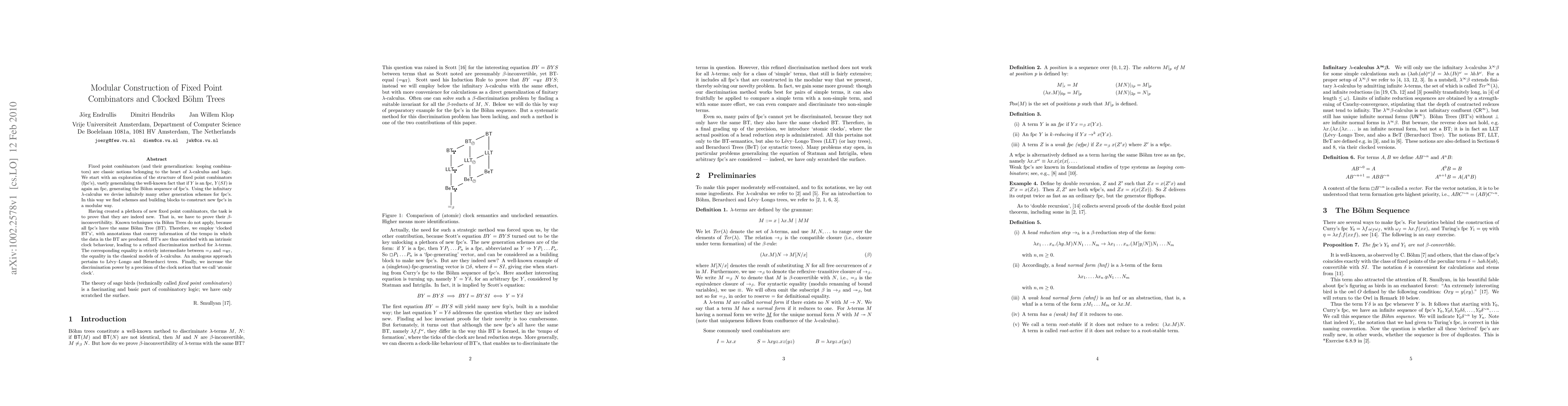 This paper explores the modular construction of fixed point combinators (fpc's) using infinitary lambda-calculus, generating new fpc's beyond the Boehm sequence. To prove the beta-inconvertibility of these new combinators, the authors introduce "clocked Boehm Trees" that incorporate temporal data production information, providing a refined discrimination method for lambda-terms.