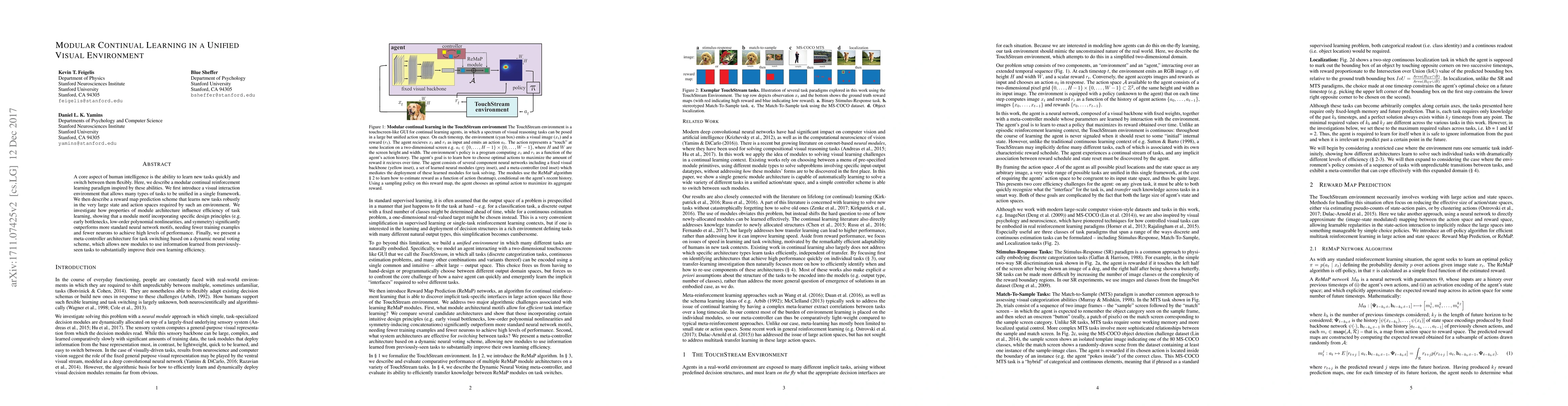 A core aspect of human intelligence is the ability to learn new tasks quickly and switch between them flexibly. Here, we describe a modular continual reinforcement learning paradigm inspired by these abilities. We first introduce a visual interaction environment that allows many types of tasks to be unified in a single framework. We then describe a reward map prediction scheme that learns new tasks robustly in the very large state and action spaces required by such an environment. We investigate how properties of module architecture influence efficiency of task learning, showing that a module motif incorporating specific design principles (e.g. early bottlenecks, low-order polynomial nonlinearities, and symmetry) significantly outperforms more standard neural network motifs, needing fewer training examples and fewer neurons to achieve high levels of performance. Finally, we present a meta-controller architecture for task switching based on a dynamic neural voting scheme, which allows new modules to use information learned from previously-seen tasks to substantially improve their own learning efficiency.
