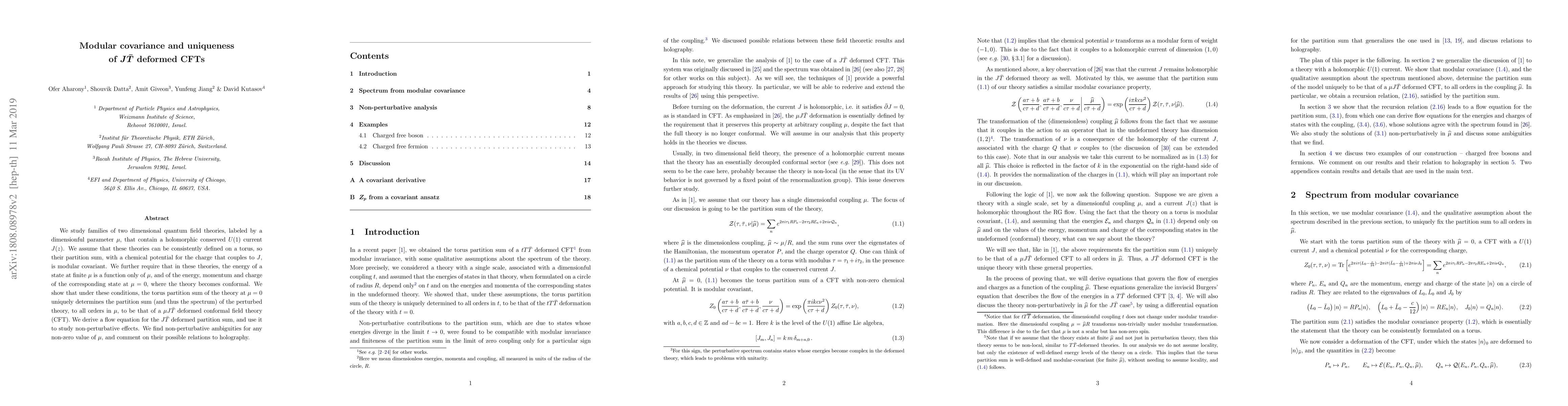 We study families of two dimensional quantum field theories, labeled by a dimensionful parameter $\mu$, that contain a holomorphic conserved $U(1)$ current $J(z)$. We assume that these theories can be consistently defined on a torus, so their partition sum, with a chemical potential for the charge that couples to $J$, is modular covariant. We further require that in these theories, the energy of a state at finite $\mu$ is a function only of $\mu$, and of the energy, momentum and charge of the corresponding state at $\mu=0$, where the theory becomes conformal. We show that under these conditions, the torus partition sum of the theory at $\mu=0$ uniquely determines the partition sum (and thus the spectrum) of the perturbed theory, to all orders in $\mu$, to be that of a $\mu J\bar T$ deformed conformal field theory (CFT). We derive a flow equation for the $J\bar{T}$ deformed partition sum, and use it to study non-perturbative effects. We find non-perturbative ambiguities for any non-zero value of $\mu$, and comment on their possible relations to holography.