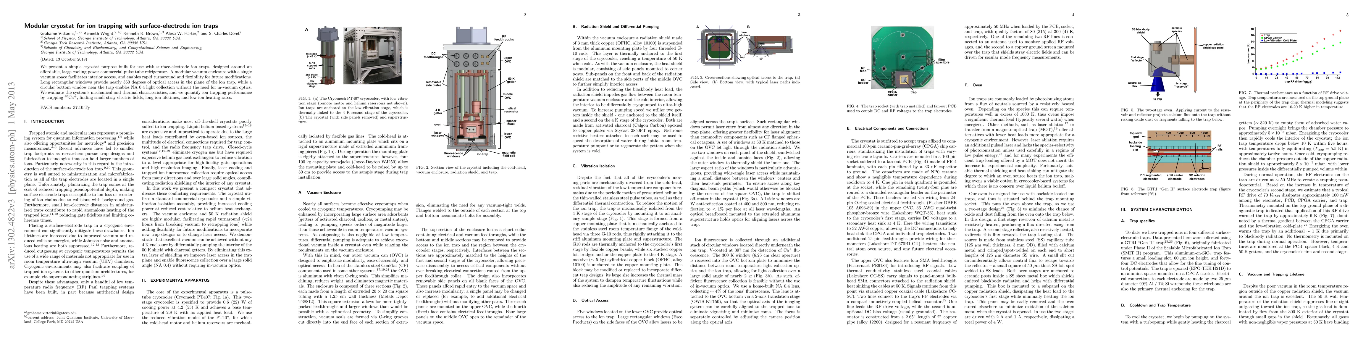 The research describes a modular cryostat designed for surface-electrode ion traps, utilizing an affordable commercial pulse tube refrigerator for cooling. It features a vacuum enclosure with extensive optical access and evaluates its performance by trapping 40Ca+ ions, demonstrating low stray electric fields and heating rates.
