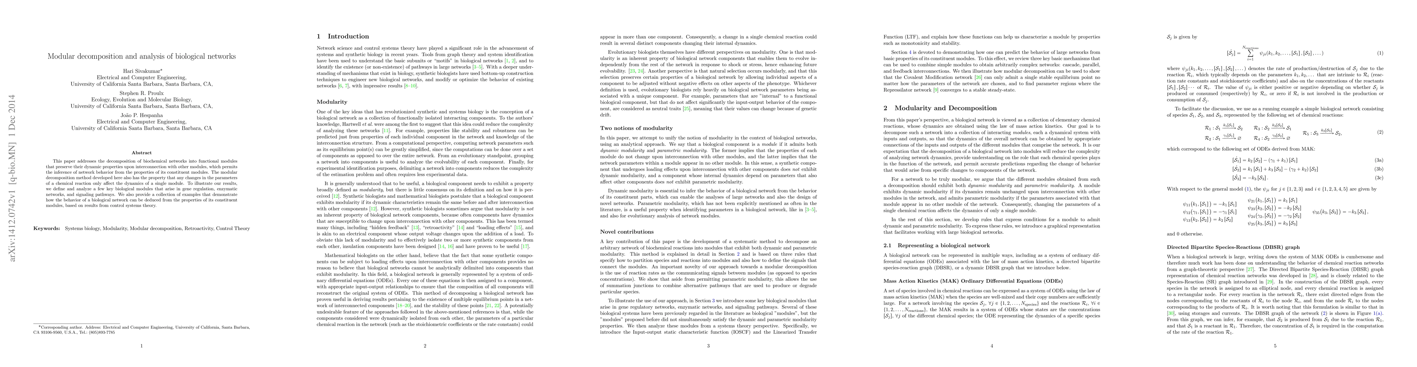 This paper develops a modular decomposition method for biochemical networks, enabling the inference of network behavior from individual modules while preserving dynamic properties. The method ensures that parameter changes affect only specific modules, illustrated through examples in gene regulation, enzymatic networks, and signaling pathways.