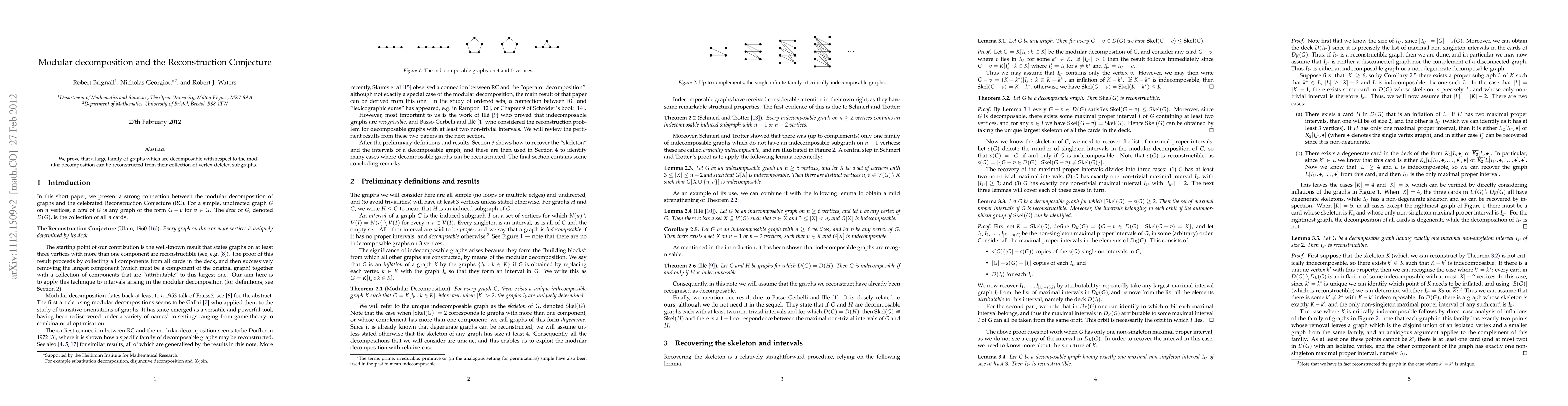 We prove that a large family of graphs which are decomposable with respect to the modular decomposition can be reconstructed from their collection of vertex-deleted subgraphs.