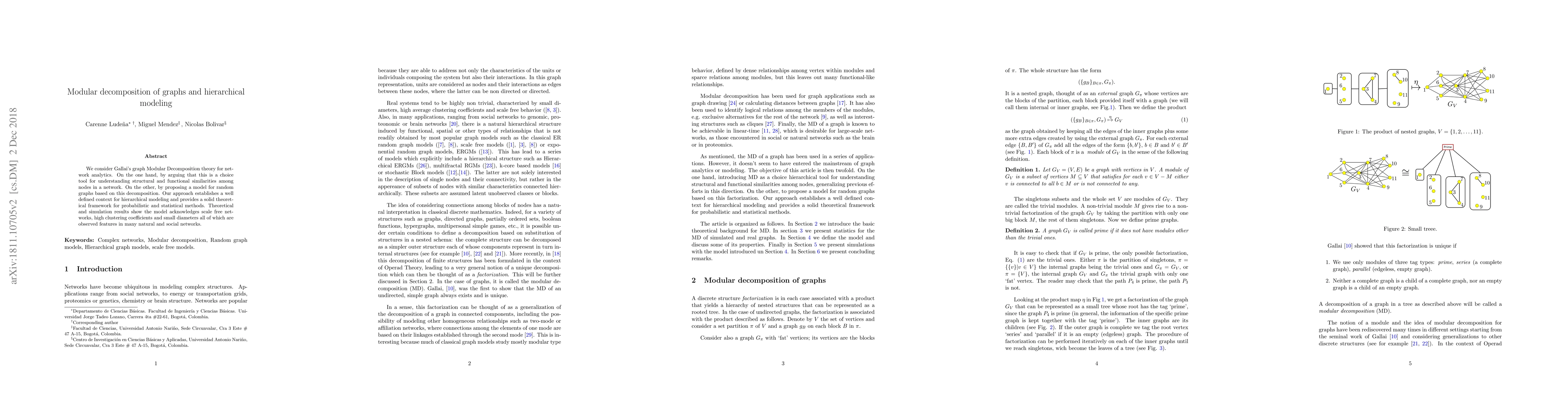 We consider Gallai's graph Modular Decomposition theory for network analytics. On the one hand, by arguing that this is a choice tool for understanding structural and functional similarities among nodes in a network. On the other, by proposing a model for random graphs based on this decomposition. Our approach establishes a well defined context for hierarchical modeling and provides a solid theoretical framework for probabilistic and statistical methods. Theoretical and simulation results show the model acknowledges scale free networks, high clustering coefficients and small diameters all of which are observed features in many natural and social networks.