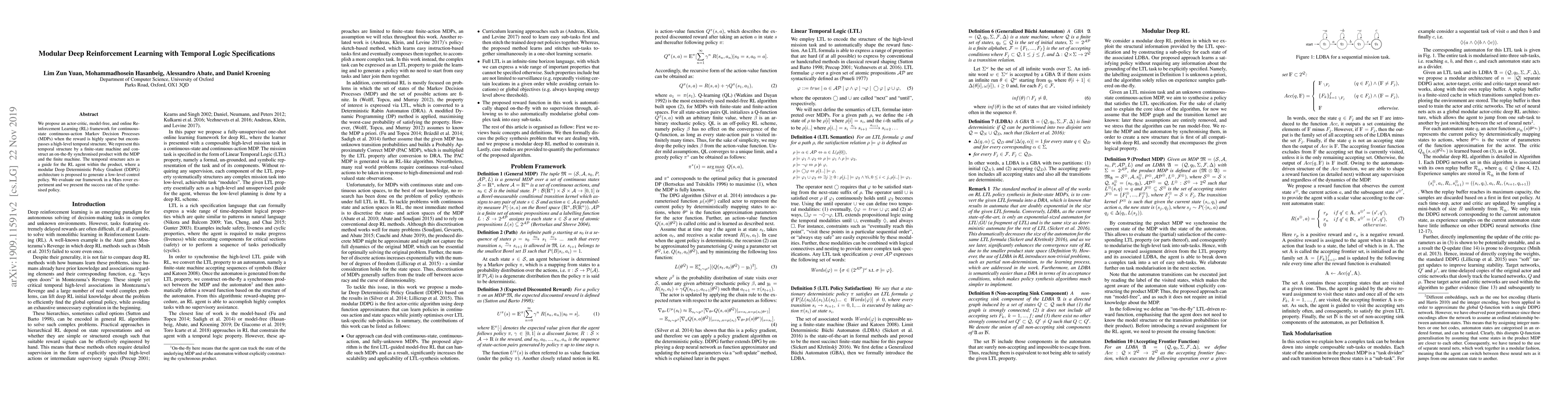 We propose an actor-critic, model-free, and online Reinforcement Learning (RL) framework for continuous-state continuous-action Markov Decision Processes (MDPs) when the reward is highly sparse but encompasses a high-level temporal structure. We represent this temporal structure by a finite-state machine and construct an on-the-fly synchronised product with the MDP and the finite machine. The temporal structure acts as a guide for the RL agent within the product, where a modular Deep Deterministic Policy Gradient (DDPG) architecture is proposed to generate a low-level control policy. We evaluate our framework in a Mars rover experiment and we present the success rate of the synthesised policy.
