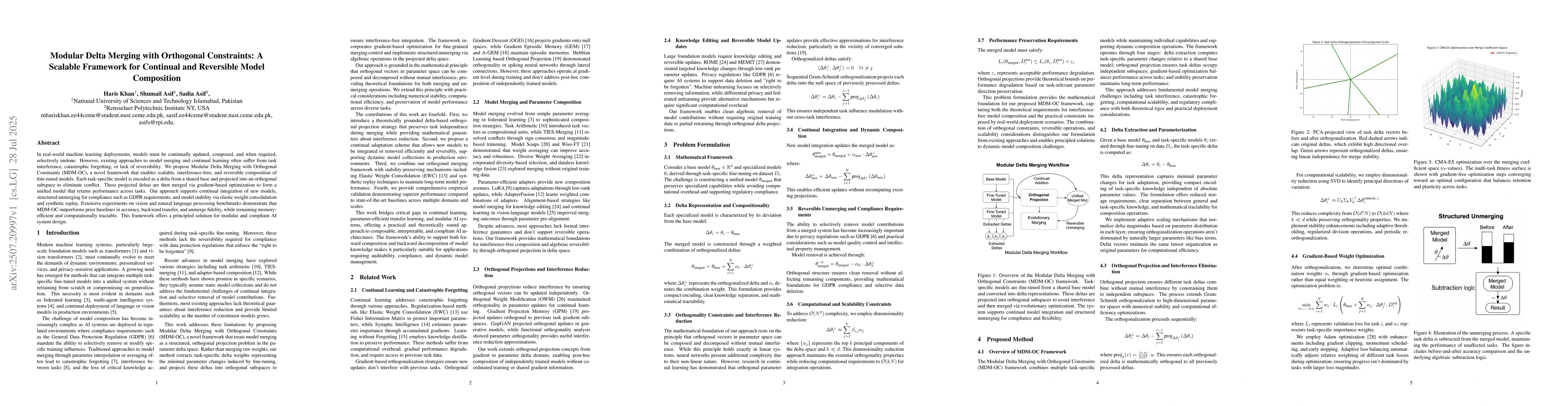 In real-world machine learning deployments, models must be continually updated, composed, and when required, selectively undone. However, existing approaches to model merging and continual learning often suffer from task interference, catastrophic forgetting, or lack of reversibility. We propose Modular Delta Merging with Orthogonal Constraints (MDM-OC), a novel framework that enables scalable, interference-free, and reversible composition of fine-tuned models. Each task-specific model is encoded as a delta from a shared base and projected into an orthogonal subspace to eliminate conflict. These projected deltas are then merged via gradient-based optimization to form a unified model that retains performance across tasks. Our approach supports continual integration of new models, structured unmerging for compliance such as GDPR requirements, and model stability via elastic weight consolidation and synthetic replay. Extensive experiments on vision and natural language processing benchmarks demonstrate that MDM-OC outperforms prior baselines in accuracy, backward transfer, and unmerge fidelity, while remaining memory-efficient and computationally tractable. This framework offers a principled solution for modular and compliant AI system design.