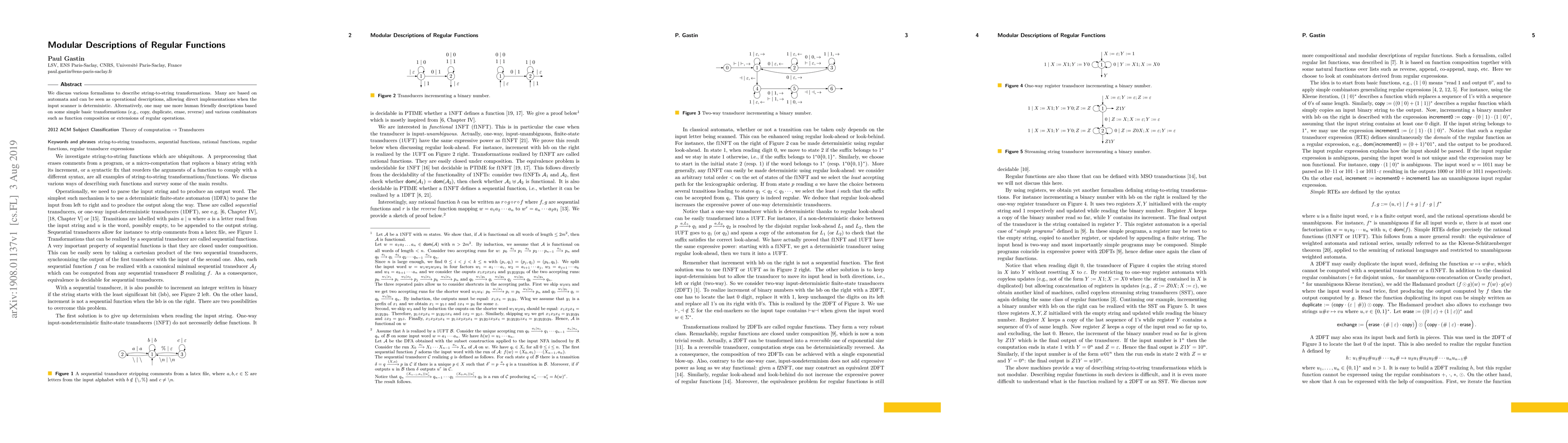 We discuss various formalisms to describe string-to-string transformations. Many are based on automata and can be seen as operational descriptions, allowing direct implementations when the input scanner is deterministic. Alternatively, one may use more human friendly descriptions based on some simple basic transformations (e.g., copy, duplicate, erase, reverse) and various combinators such as function composition or extensions of regular operations.