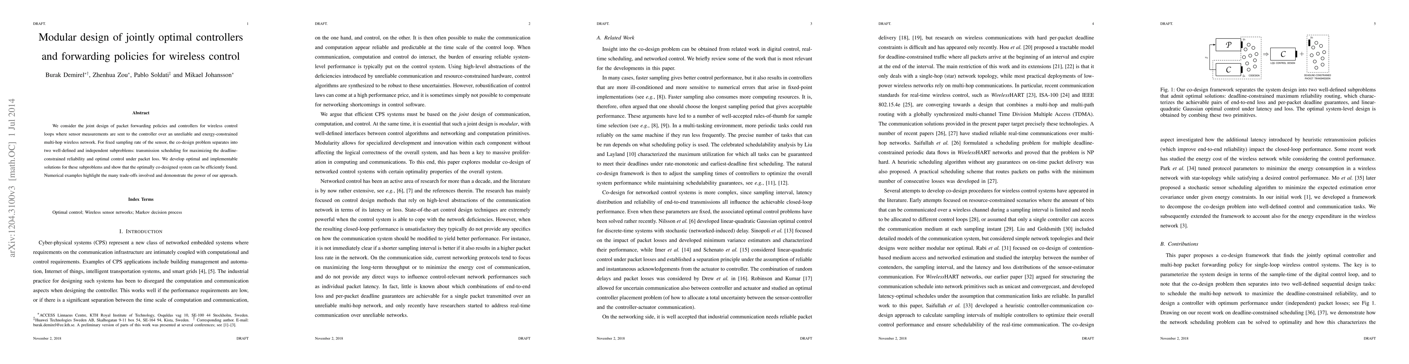 This paper presents a modular design for jointly optimal controllers and packet forwarding policies in wireless control systems, addressing the challenges of unreliable and energy-constrained multi-hop networks. It separates the co-design problem into transmission scheduling and optimal control under packet loss, providing implementable solutions for both subproblems and demonstrating their efficiency through numerical examples.