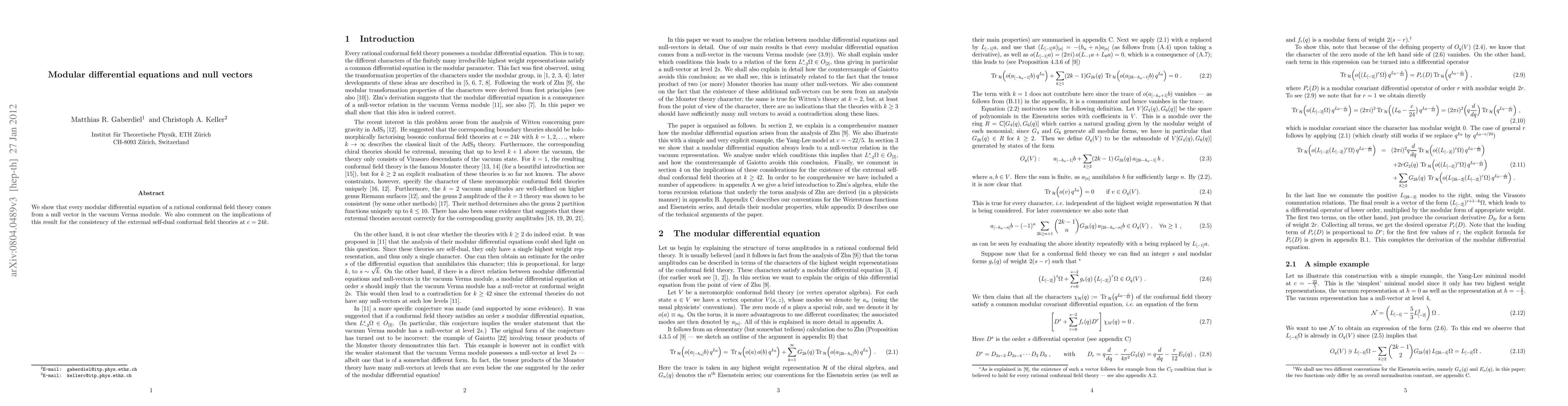 Summary: This paper demonstrates that modular differential equations in rational conformal field theory originate from null vectors in the vacuum Verma module, and discusses the implications for the consistency of extremal self-dual conformal field theories at specific central charges.