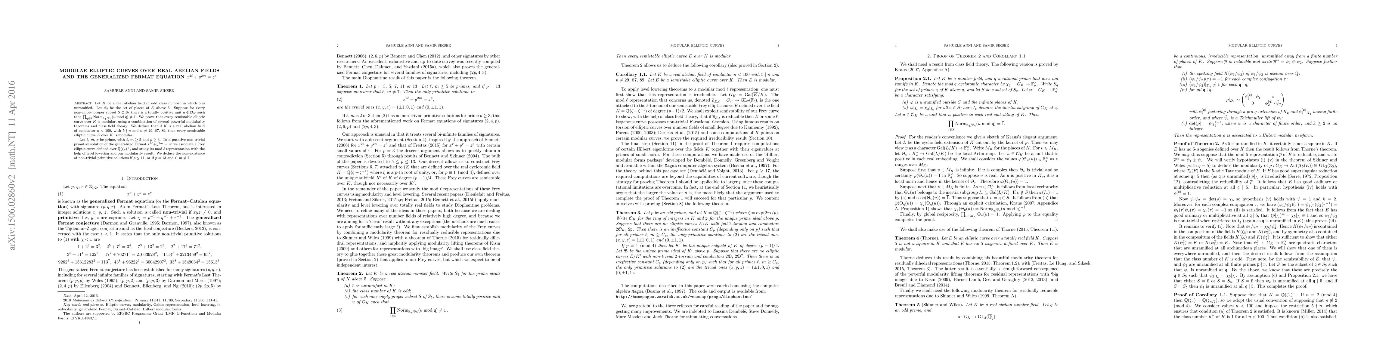 This paper establishes a new modularity theorem for semistable elliptic curves over real abelian fields, proving that such curves are modular under specific conditions. It also links the generalized Fermat equation to Frey curves, using modularity results to demonstrate the non-existence of non-trivial primitive solutions under certain prime constraints.