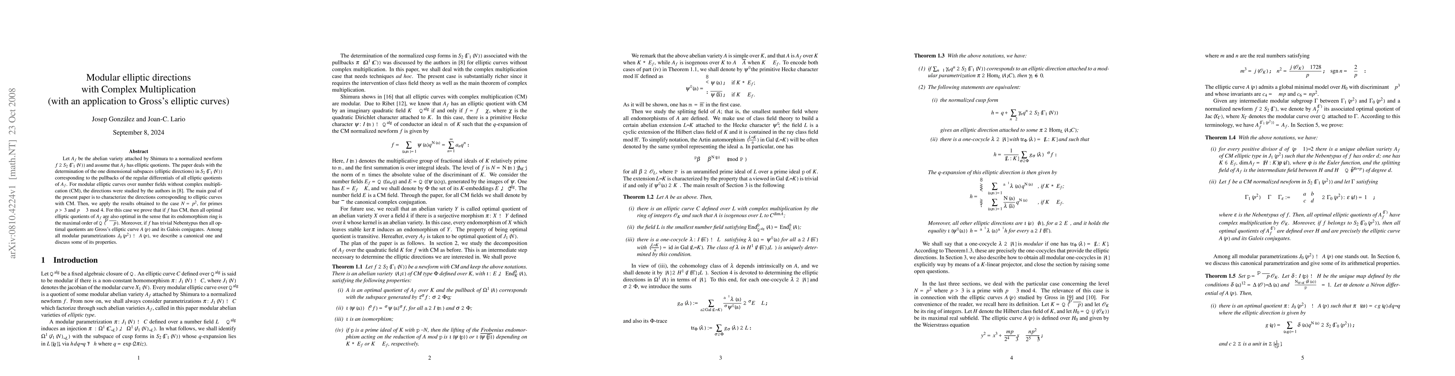 Summary: The paper investigates modular parametrizations of elliptic curves derived from abelian varieties with complex multiplication, focusing on normalized newforms in S_2(Gamma_1(N)), and applies the findings to Gross's elliptic curves A(p).