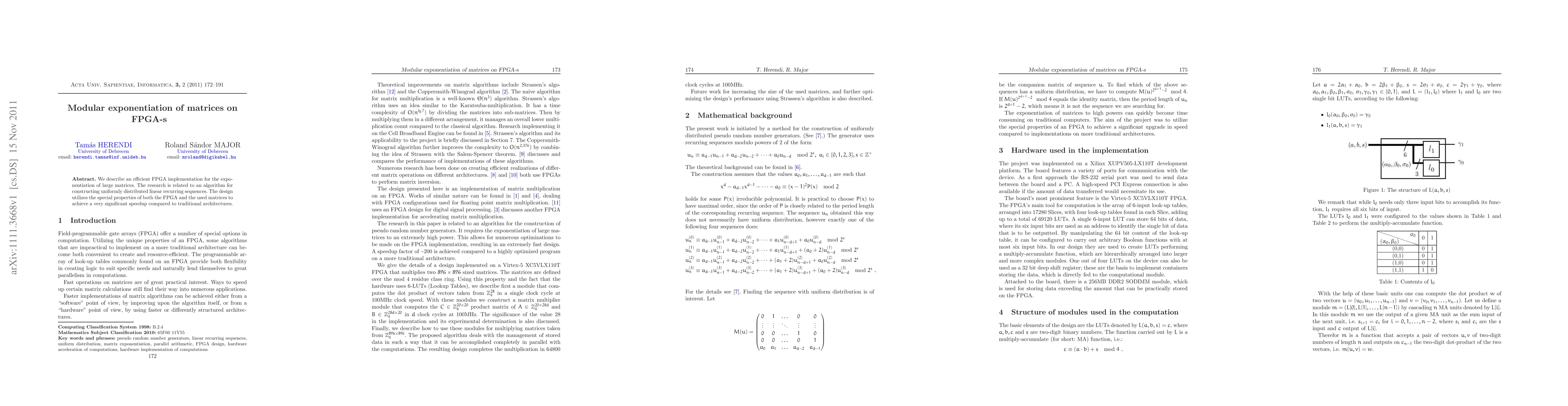 We describe an efficient FPGA implementation for the exponentiation of large matrices. The research is related to an algorithm for constructing uniformly distributed linear recurring sequences. The design utilizes the special properties of both the FPGA and the used matrices to achieve a very significant speedup compared to traditional architectures.