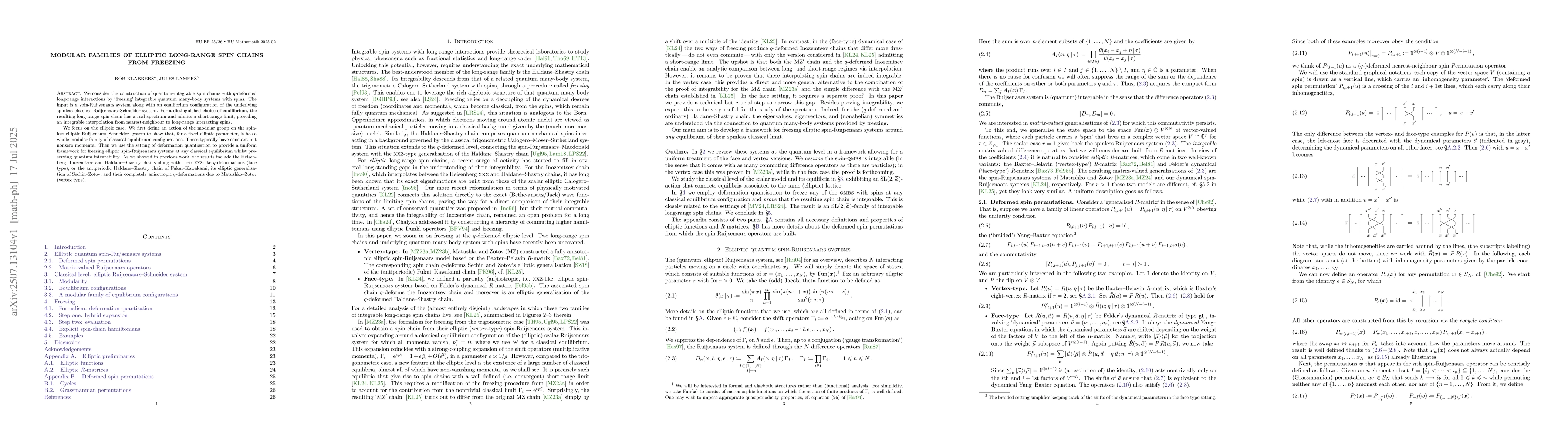 We consider the construction of quantum-integrable spin chains with q-deformed long-range interactions by `freezing' integrable quantum many-body systems with spins. The input is a spin-Ruijsenaars system along with an equilibrium configuration of the underlying spinless classical Ruijsenaars-Schneider system. For a distinguished choice of equilibrium, the resulting long-range spin chain has a real spectrum and admits a short-range limit, providing an integrable interpolation from nearest-neighbour to long-range interacting spins. We focus on the elliptic case. We first define an action of the modular group on the spinless elliptic Ruijsenaars-Schneider system to show that, for a fixed elliptic parameter, it has a whole modular family of classical equilibrium configurations. These typically have constant but nonzero momenta. Then we use the setting of deformation quantisation to provide a uniform framework for freezing elliptic spin-Ruijsenaars systems at any classical equilibrium whilst preserving quantum integrability. As we showed in previous work, the results include the Heisenberg, Inozemtsev and Haldane-Shastry chains along with their xxz-like q-deformations (face-type), or the antiperiodic Haldane-Shastry chain of Fukui-Kawakami, its elliptic generalisation of Sechin-Zotov, and their completely anisotropic q-deformations due to Matushko-Zotov (vertex type).