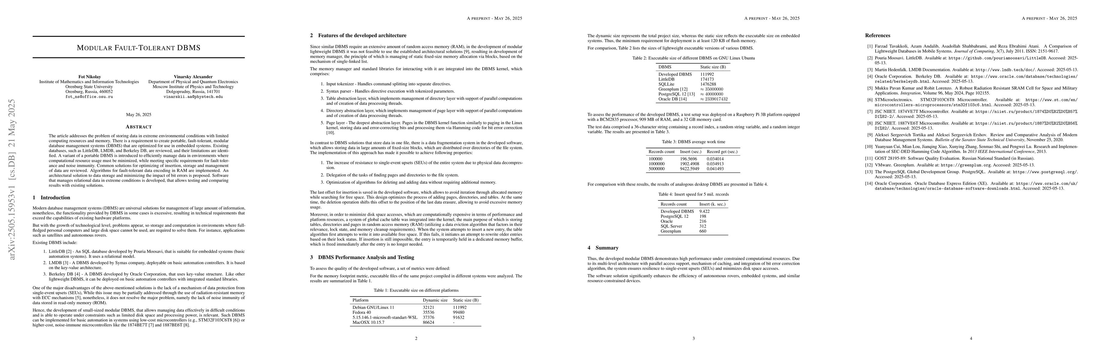 The research introduces a modular, fault-tolerant DBMS optimized for embedded systems in extreme conditions with limited resources. It proposes data storage and error minimization techniques, and presents software for relational data management in harsh environments, offering comparisons with existing solutions.