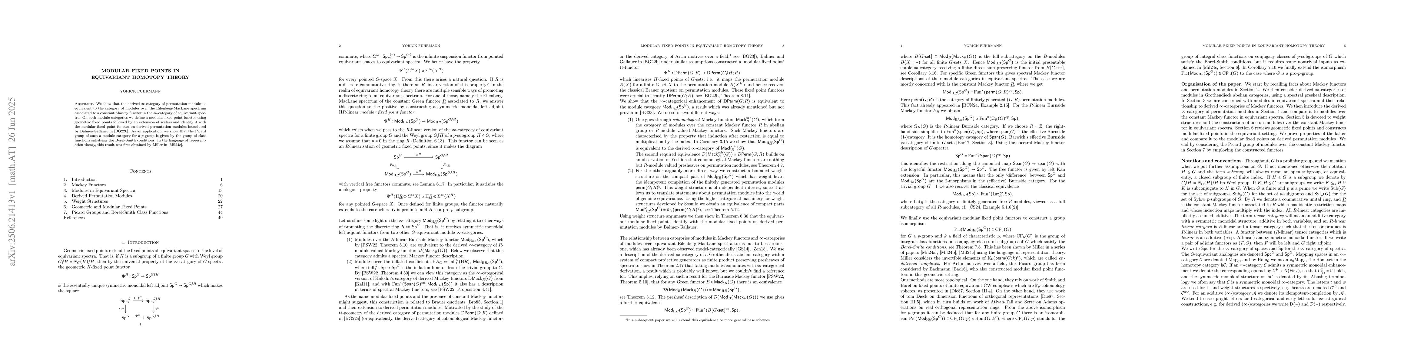 The paper provides a detailed ∞-categorical framework for modular fixed points, establishing equivalences between derived categories of permutation modules, Mackey functors, and equivariant spectra, along with new constructions of weight structures.