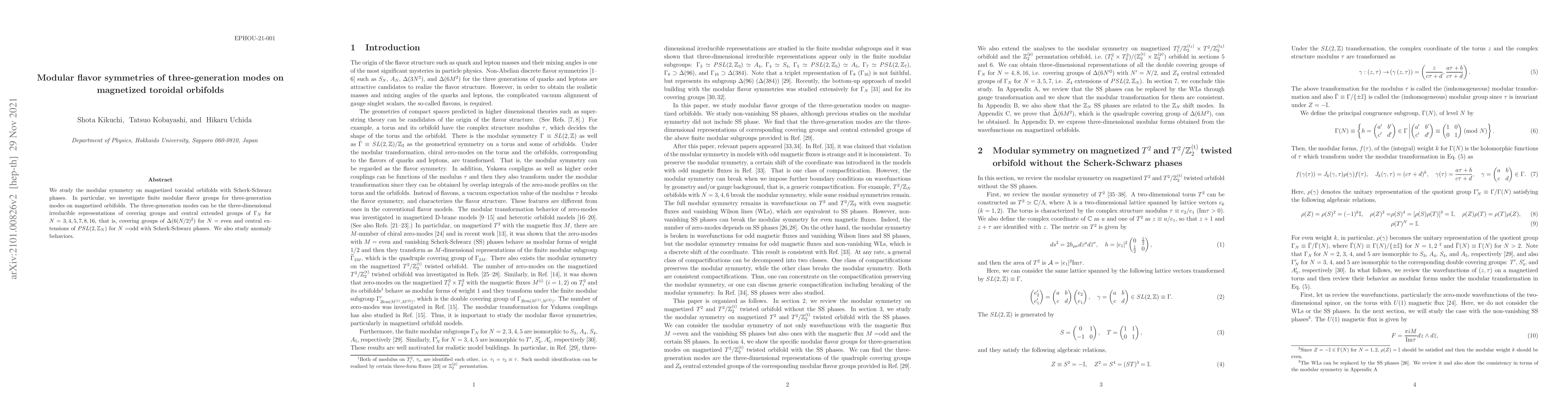 This paper explores modular symmetry on magnetized toroidal orbifolds, focusing on finite modular flavor groups for three-generation modes. It examines three-dimensional irreducible representations for specific covering and central extended groups with Scherk-Schwarz phases, and analyzes associated anomaly behaviors.