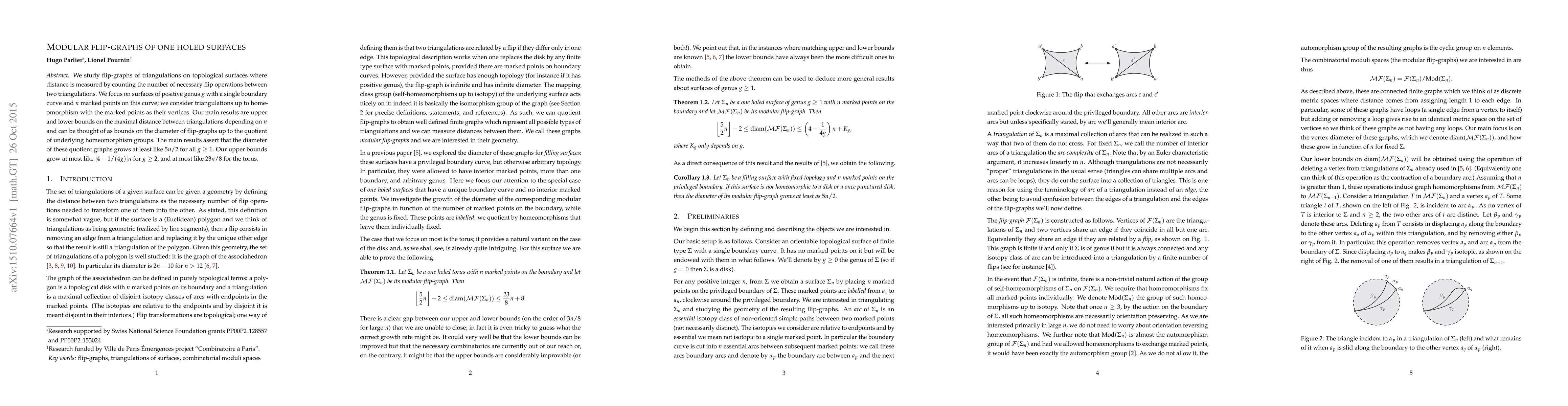 This paper investigates flip-graphs of triangulations on one-holed surfaces, establishing upper and lower bounds for the maximal distance between triangulations. It finds that the diameter of these graphs grows at least like $5n/2$ for all genus $g\geq 1$, with upper bounds at most $[4 -1/(4g)]n$ for $g\geq 2$ and $23n/8$ for the torus.