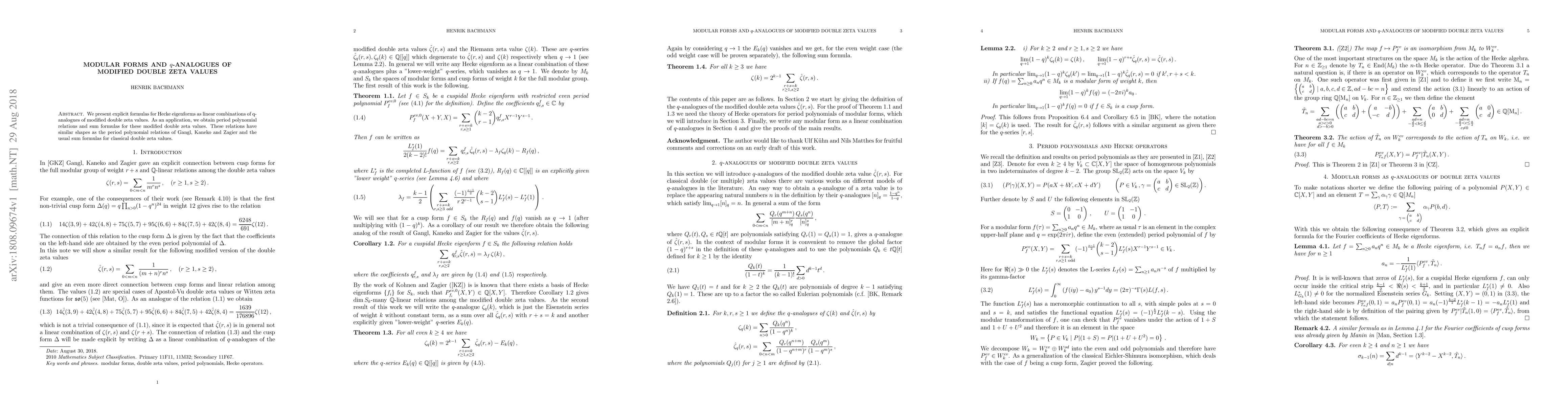 Researchers found explicit formulas for Hecke eigenforms as linear combinations of q-analogues of modified double zeta values, leading to period polynomial relations and sum formulas with similarities to existing results in the field.