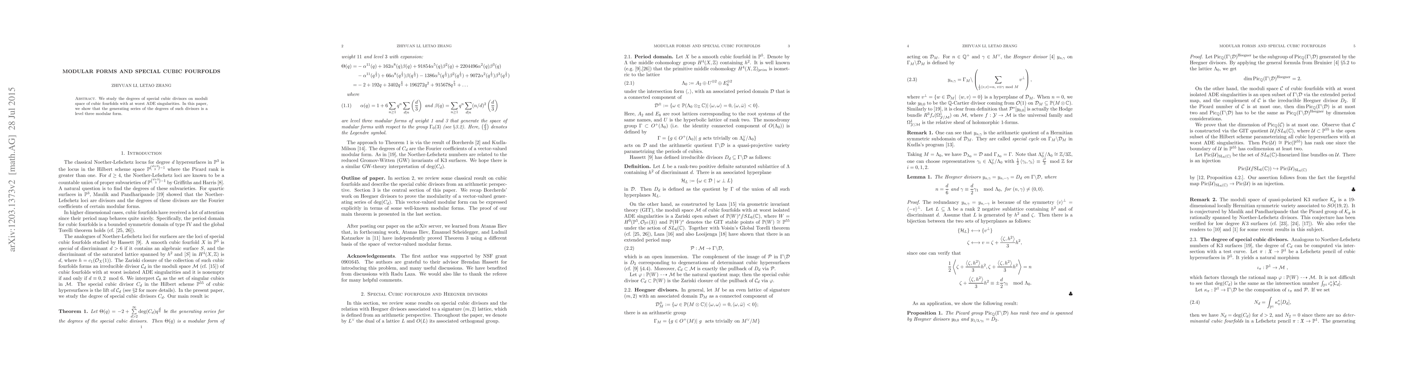 Summary: This paper investigates the degree of special cubic fourfolds in the Hilbert scheme using the generating series of Heegner divisors from the even lattice of signature (2, 20). The focus is on understanding the underlying modular forms and their connection to these geometric objects.