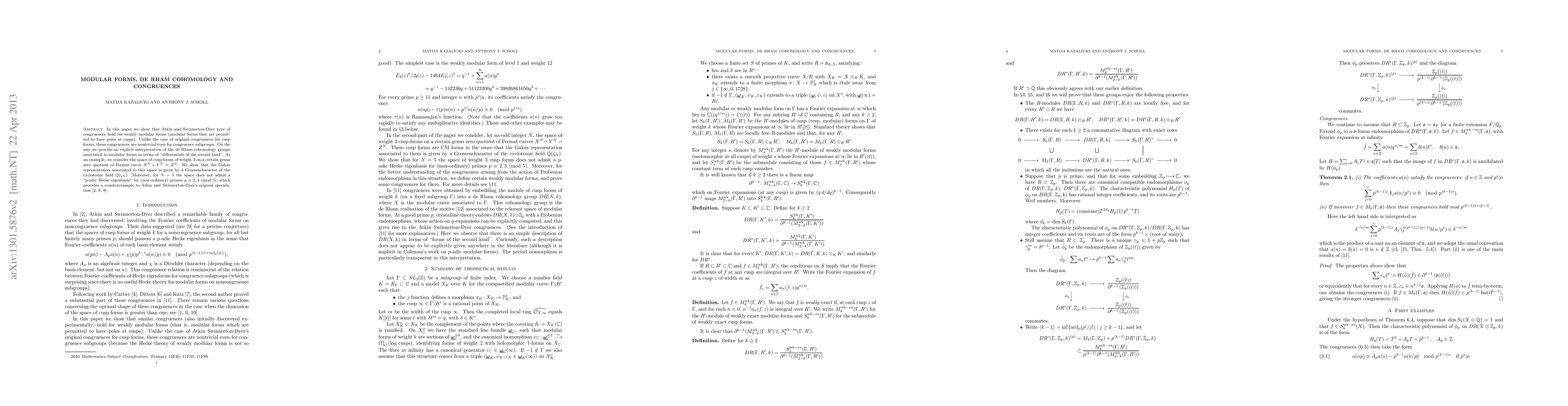 In this paper we show that Atkin and Swinnerton-Dyer type of congruences hold for weakly modular forms (modular forms that are permitted to have poles at cusps). Unlike the case of original congruences for cusp forms, these congruences are nontrivial even for congruence subgroups. On the way we provide an explicit interpretation of the de Rham cohomology groups associated to modular forms in terms of "differentials of the second kind". As an example, we consider the space of cusp forms of weight 3 on a certain genus zero quotient of Fermat curve X^N+Y^N=Z^N. We show that the Galois representation associated to this space is Grossencharacter of a cyclotomic field $\Q(\zeta_N)$. Moreover, for N=5 the space does not admit a "$p$-adic Hecke eigenbasis" for (non-ordinary) primes $p\equiv 2,3 \pmod{5}$, which provides a counterexample for original Atkin and Swinnerton-Dyer speculaction (see [2], [7], [8]).